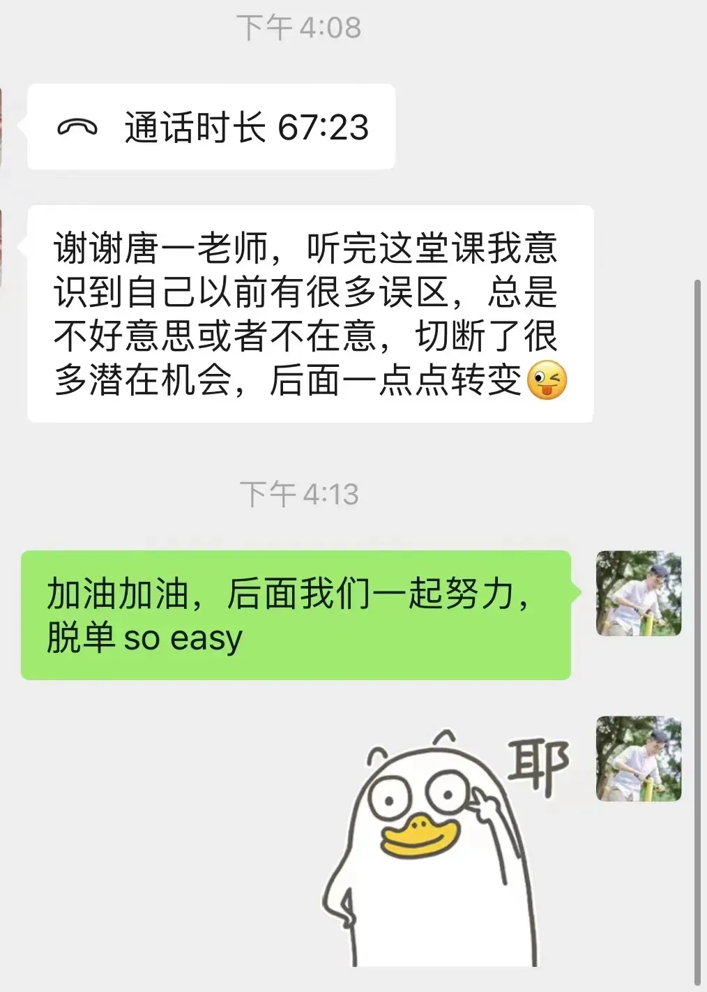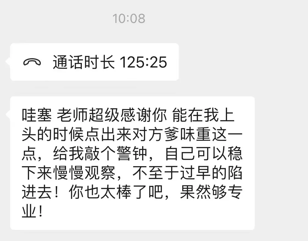 你之所以不会聊天,是因为你不知道那些会聊天的人,到底是怎么聊的。现在只要报名,就送我和妹子的「聊天记录」作为教材!这些聊天记录,是根据我过去和妹子真实聊天记录改编而成的(去掉了个人信息和没必要部分,也征得了对方同意)。你把这些聊天记录,和自己平时的聊天一对比,自然就知道自己哪里需要提高了!而且熟读这些聊天记录,你都不用多动脑子,照着教材来回复对方就可以啦!我的这个课程,不仅有理论课,还有作业和课后实操(具体是什么,保密)。在你做完作业和实操之后,我就会进行对你的作业进行点评,这样你就知道自己哪里做得不够好。然后在「做作业-点评-再做作业-再点评」的过程中,你自然就得到提高了。平时你上的很多课程,都只是让你听录音,你听完就算了,迷迷糊糊的,有问题也不知道找谁来回答。而我这个课程,完全是我亲自为你一对一上课,你可以随时提问,我随时回答!我还能根据你的情况,针对性地为你上课,弥补你最需要补上的情感短板!这门课程集中了我做情感咨询师这么久的所有心血,反复打磨,每一节课的教案都经过四到五遍的修改。我真的觉得,它非常有用,如果你真的想脱单,这个课程一定是你最好的选择。第一期招了7名学员,学员们对这个课程也是赞不绝口: