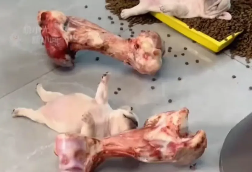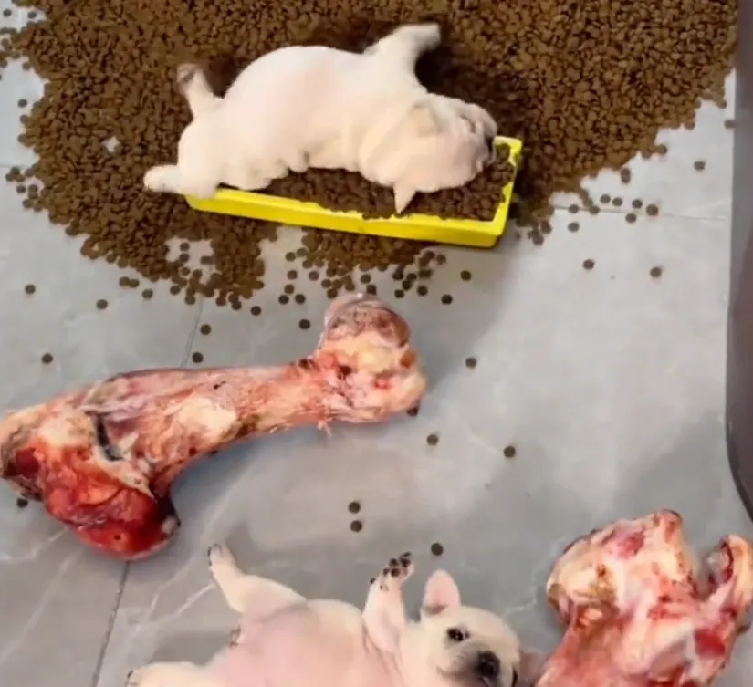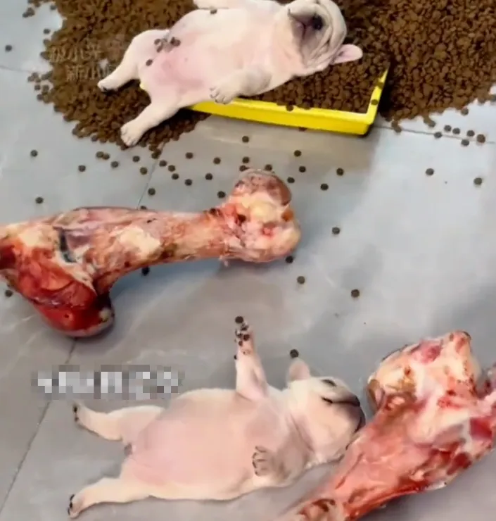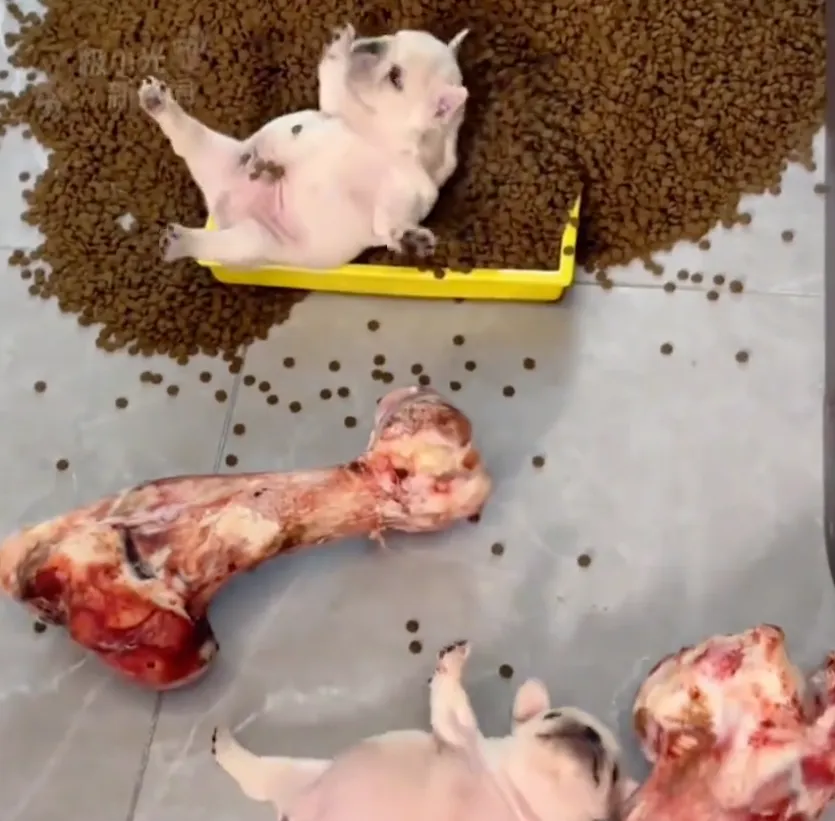 这次这两只小狗崽,在男朋友准备的“自助餐”面前,哪能抵挡得住诱惑,结果就把自己撑成了这副模样,也是让人笑得肚子疼。当然,幼犬消化系统尚未发育完全,胃容量仅占体重2%-3%。以法斗为例,两个月大幼犬理想体重应为3-4公斤,每日科学喂食量约120克。现场散落的狗粮超过幼犬两周所需,而牛骨碎片极易划伤肠道,所以还是要注意一点。