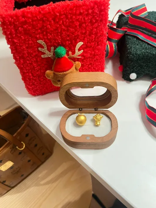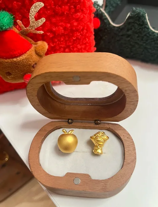 先来和大家唠一下它的细节,这两颗小金是用AU999足金做的,金色是那种很温润的奶油金,完全不会有暴发户的廉价感。一个是超级可爱的金苹果,做成了哑光的磨砂质感,圆润饱满,苹果叶子还做了立体弯弯的细节,看着就很治愈。另一个是迷你花束,花朵部分是高光工艺,底下的小蝴蝶结特别精致,细节控会疯狂尖叫。两颗金豆豆各自重量都在1.2g左右,单颗价格在520-580元区间,真的属于小预算也能承受的那种用心浪漫。木质礼盒也很有质感,打开的瞬间氛围感直接拉满,真的满满的圣诞仪式感。
