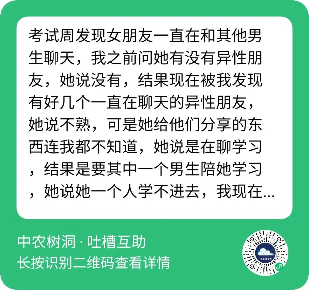 考试周发现女朋友一直在和其他男生聊天,我之前问她有没有异性朋友,她说没有,结果现在被我发现有好几个一直在聊天的异性朋友,她说不熟,可是她给他们分享的东西连我都不知道,她说是在聊学习结果是要其中一个男生陪她学习她说她一个人学不进去