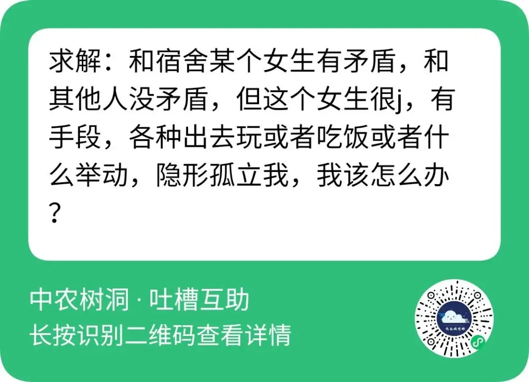 求解:和宿舍某个女生有矛盾,和其他人没矛盾,但这个女生很,有手段,各种出去玩或者吃饭或者什么举动,隐形孤立我,我该怎么办?