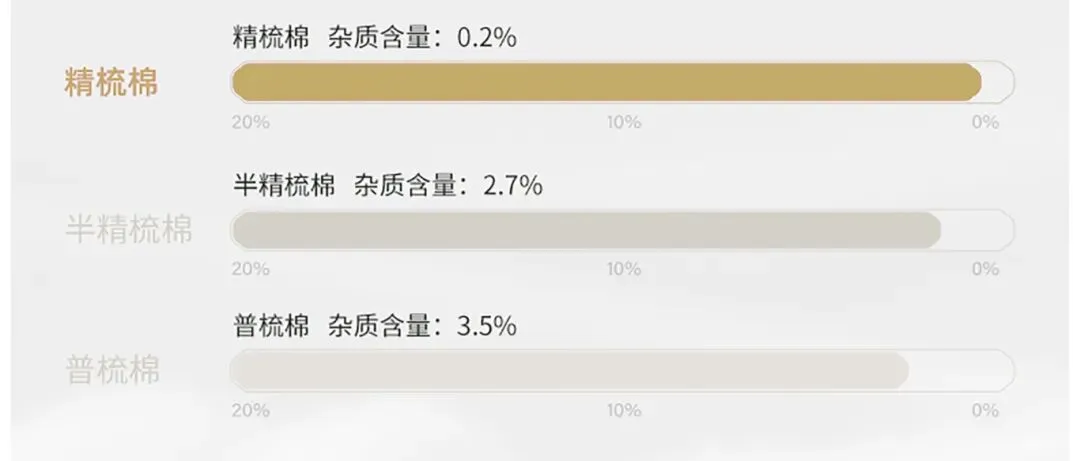 经过这么一道“筛选”,留下来的棉花精英,杂质含量只有惊人的0.2%。(普通棉大约3.5%)。