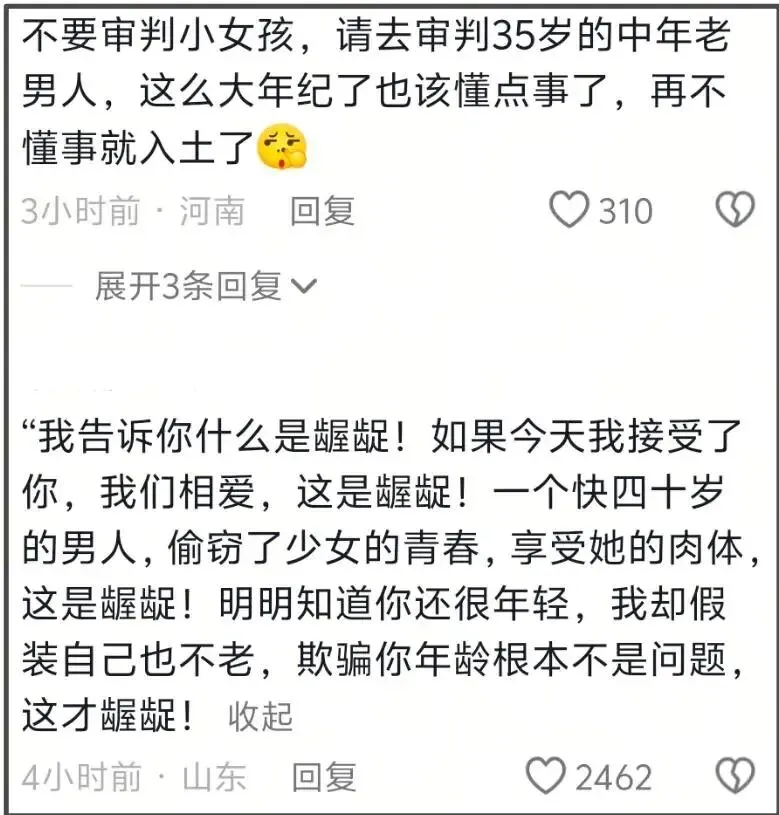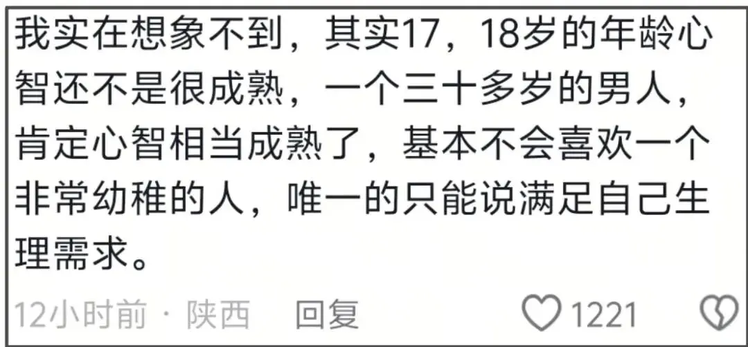 有人拿鹿晗和关晓彤举例,关晓彤和鹿晗在一起的时候,和刘一诺差不多大,如今鹿晗和檀健次都卷入了司晓迪风波,某种程度上,老男人找小姑娘恋爱,就是看中女生年纪小、没经验、好哄骗。