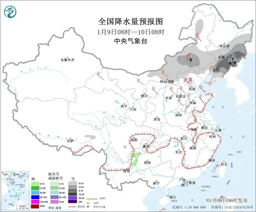 1月9日8时至10日8时,内蒙古中部和东北部、东北地区、河北北部、贵州西北部等地部分地区有小到中雪或雨夹雪,其中,内蒙古中部、吉林东部、辽宁北部等地部分地区有大雪,局地有暴雪(10~12毫米);贵州西北部、云南东北部等地部分地区有小雨。内蒙古、辽宁中南部、甘肃河西、陕西北部、华北、黄淮、江淮等地部分地区有4~6级风;渤海、渤海海峡、黄海中北部、巴士海峡将有6~8级风,阵风9级。