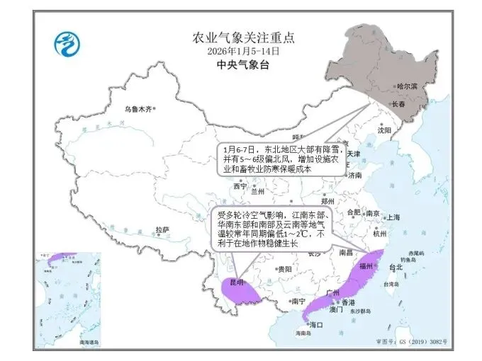 建议:北方冬麦区应根据苗情、墒情加强分类管理,科学调控水肥,因苗施策促弱转壮,确保小麦安全越冬。东北地区、内蒙古东北部等地及时检修加固设施和养殖业棚舍,做好防风保温及饲料储备工作。南方地区在降温前采取覆盖、熏烟等措施减轻在地作物可能受到的低温寒冻害;加强油菜、小麦等作物田间管理,促进弱苗转化,控制旺长;茶园、果园宜及时开展修剪、清园、施肥等工作,帮助植株恢复树势,安全越冬。各地加强病虫害的监测与防治工作,降低病菌虫卵越冬基数。