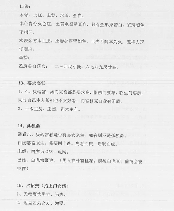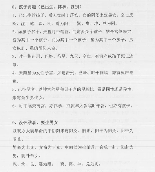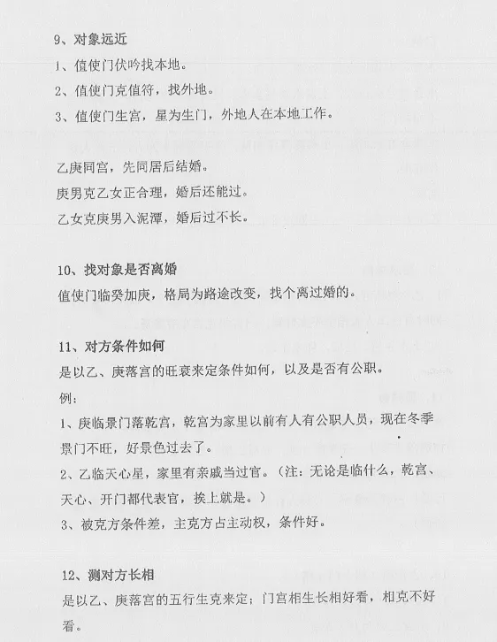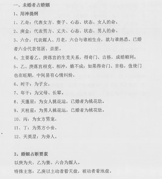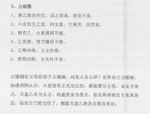 预测已婚之人,若本人求测,以日干为求测者,相合之干为配偶。又可以乙奇为妻子,庚为丈夫,或以妻子年命为妻子,丈夫年命为丈夫。还可以妻子年命相合之干为丈夫,以丈夫年命相合之干为妻子。若代人求测、还可以用神相合之干为配偶,以六合为婚姻。婚姻美满与否主要看夫妻双方落宫与六合落宫三者之间的生克关系。若妻子落宫克丈夫落宫,妻子对丈夫不满意,婚姻破裂时,妻子提出离婚;丈夫落宫克妻子落宫,则丈夫对妻子不满意,婚娟破融时丈夫遇出高婚。大合落宫克丈夫落宫,此婚对文夫不利:大合落言克妻子落富,此婚对妻子不利。若大妻双方落宫旺相,又相生相和天赛吴展和美。丈夫落宫生妻子落宫,丈夫爱妻子;要子落宫生丈夫落宫妻于敬丈夫。丈夫落宫生六合落宫,丈夫家庭观念强:妻子落宫生大合落宫妻子忠贞不二。