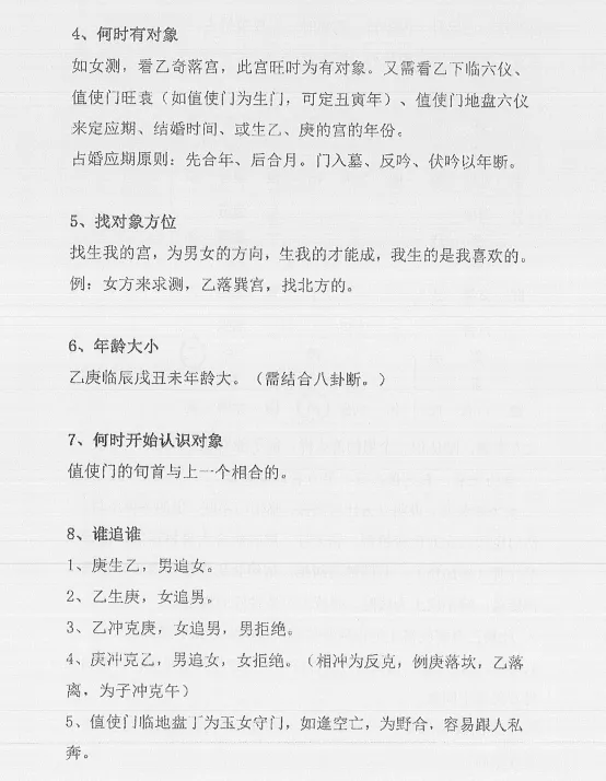预测恋爱之人,以双方年命为主要用神,男方年命代表男方,女方年命代表女方,兼看乙庚:乙奇代表女方,庚代表男方。六合代表媒人。女方落宫生男方落富,女方主动;男方落宫生女方落宫,男方主动。女方落宫克男方落宫或六合落宫,女方不同意此婚;男方落宫克女方落宫或六合落宫,男方不同意此婚。六合落宫生女方落宫,媒人偏向女方;六合落宫生男方落宫,媒人偏向男方。