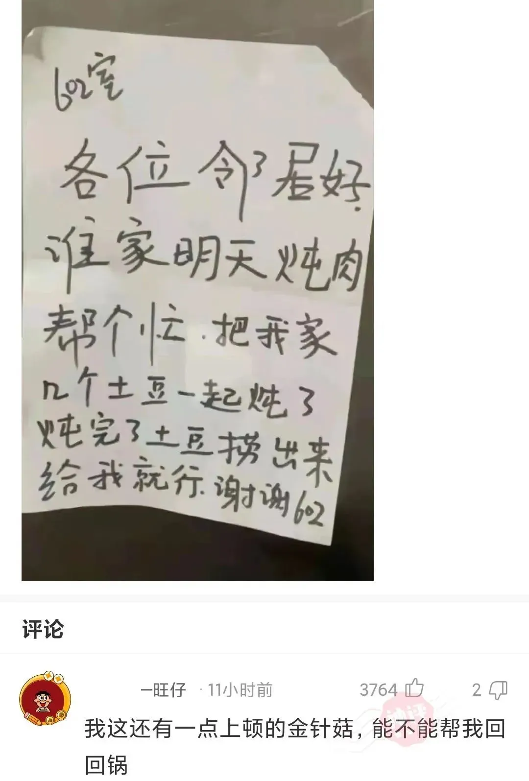 各位邻居好,谁家明天炖肉?帮个小忙,把我家几个土豆一起炖了,炖完了土豆捞出来,给我就行了,万分感谢!