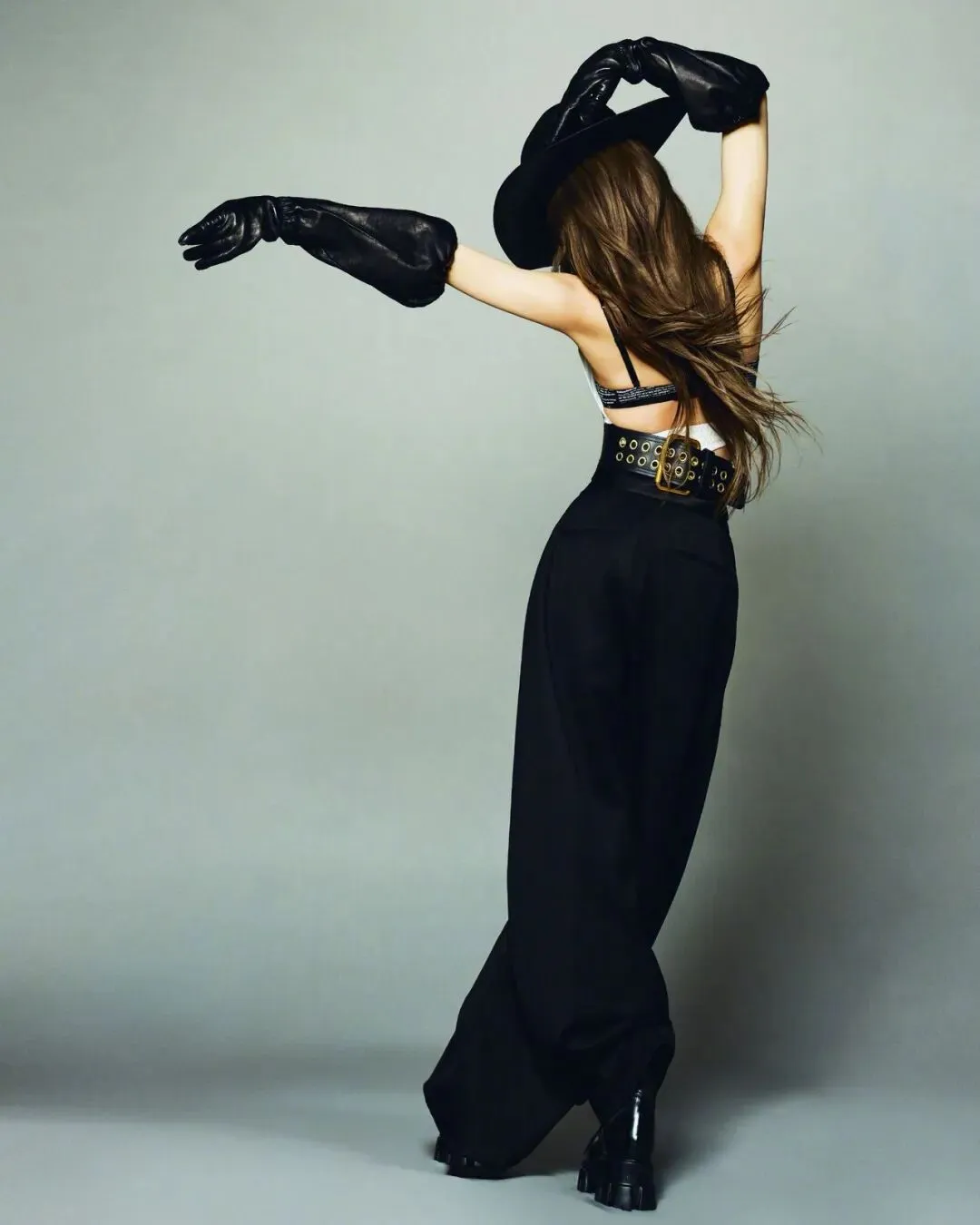 点睛之笔必须是配饰! 鎏金手链和项链叠戴,奢华感直接拉满。最绝的是那顶闪钻贝雷帽,灯光下折射出的星光,瞬间把巨星氛围拉到顶点。 还有皮质腰封、金属链条的加入,在她经典的“Elva Style”里掺了点朋克张力,复古和现代撞得超有味道。
