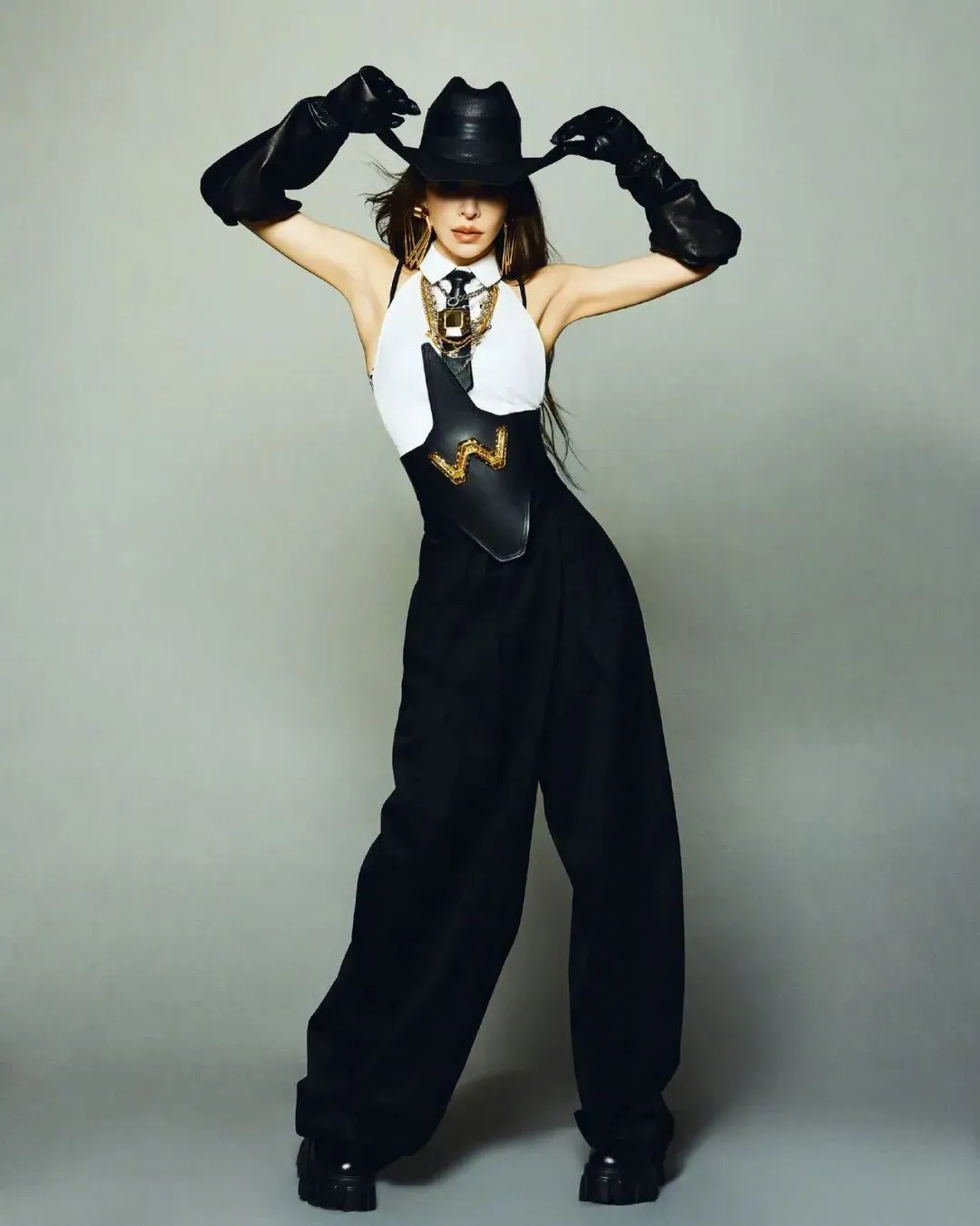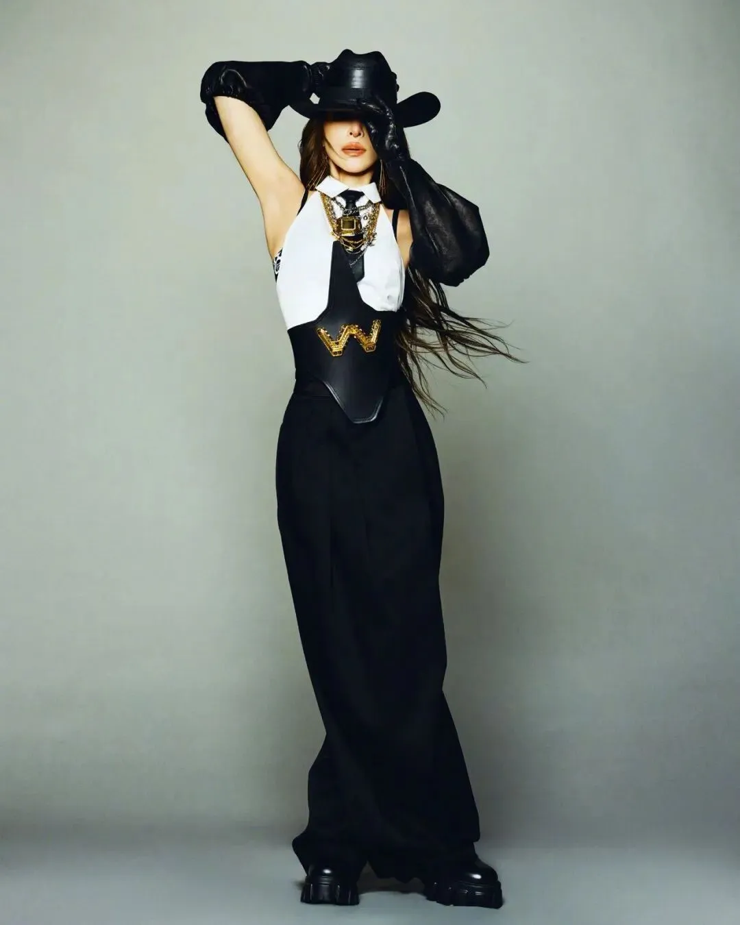 部分大片里,她戴黑色礼帽配长靴,系着链条领带还和骏马同框,飒气值直接爆表! 网友都在喊:46岁还有这时尚统治力,千禧天后的影响力果然名不虚传。