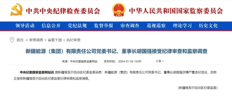 3. 腾讯新闻:《新疆能源(集团)有限责任公司董事长胡国强被查 去年9月巡视组刚反馈问题》