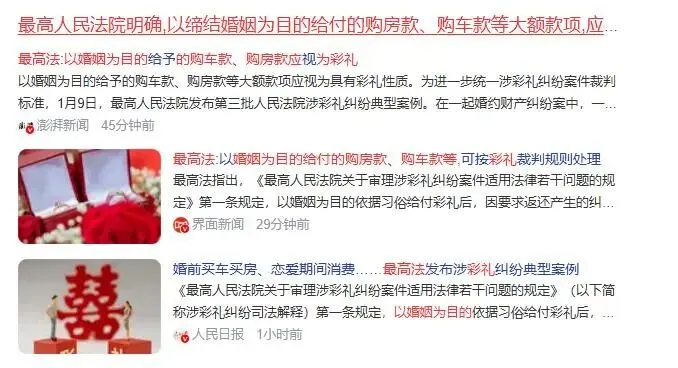 今年1月9日最高人民法院发布的涉彩礼纠纷典型案例揭示了一个让人意外的法律真相:婚前赠予的购房款、购车款等大额款项,法院明确认定为具有彩礼性质,适用彩礼返还规则处理。