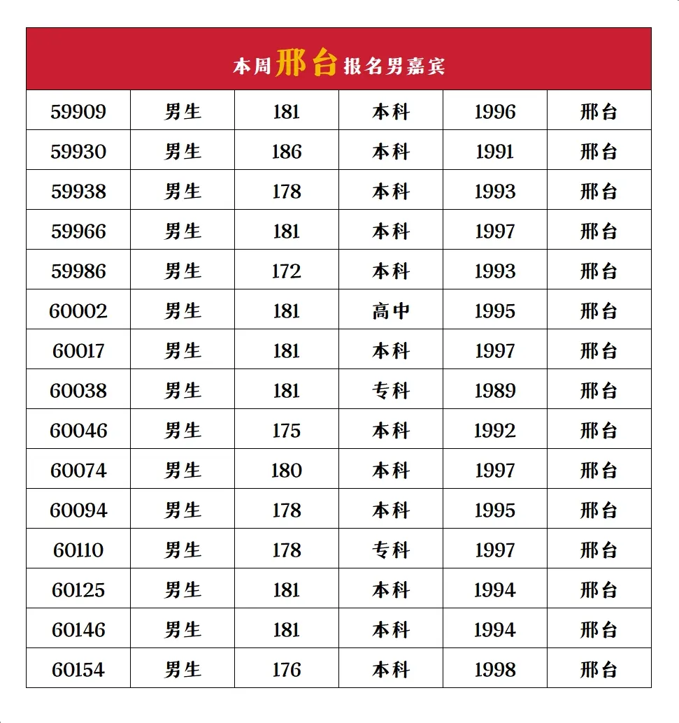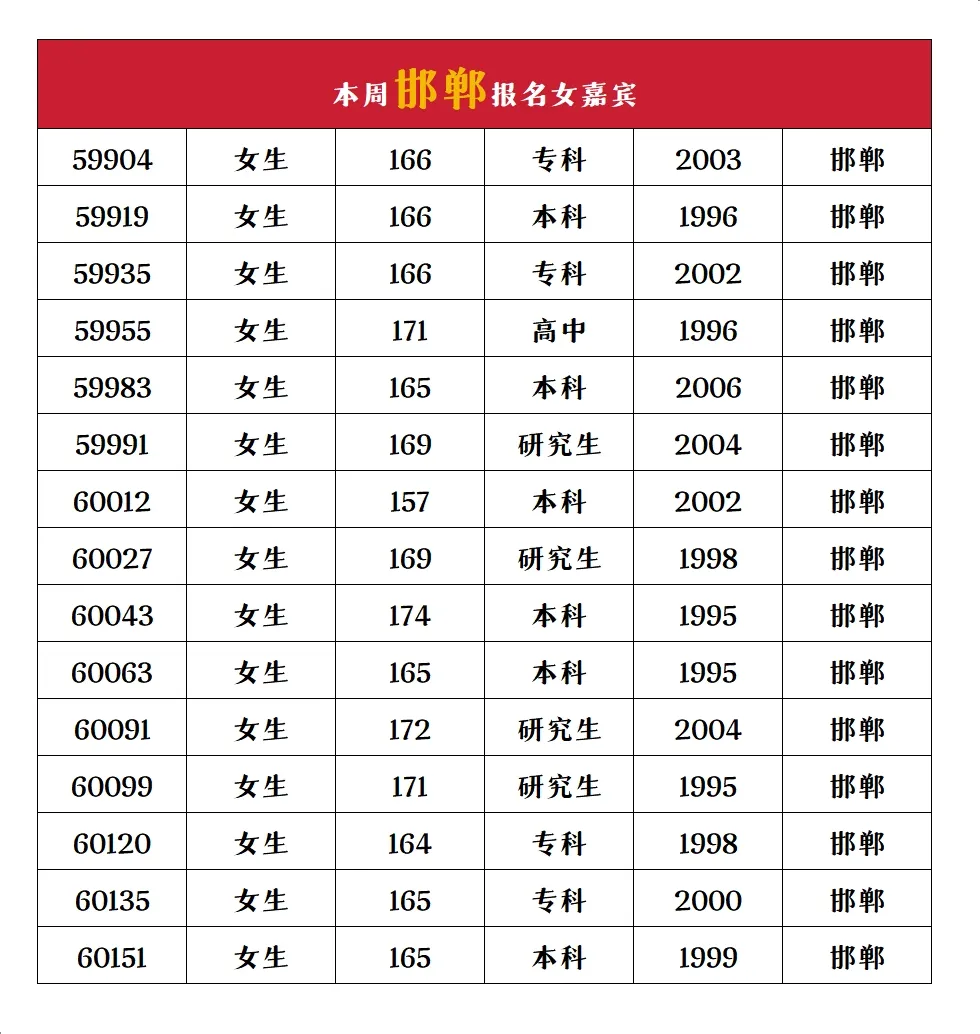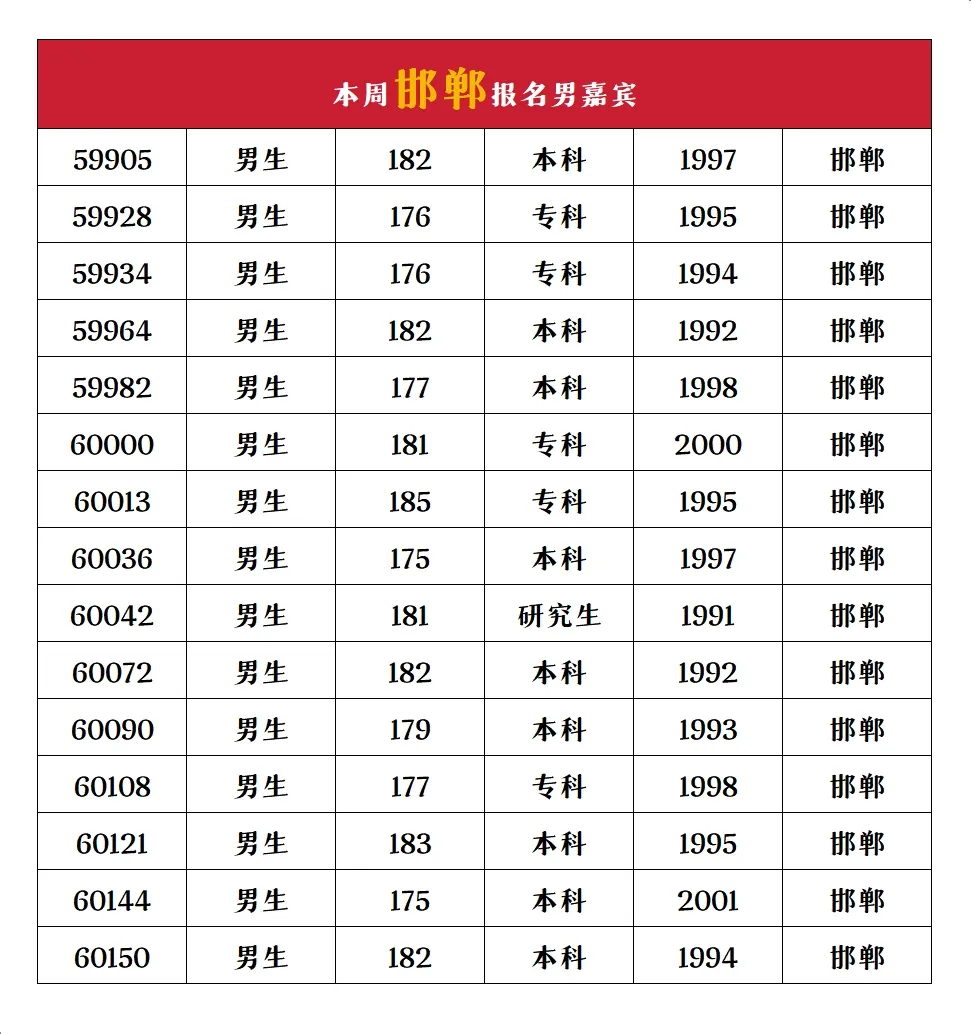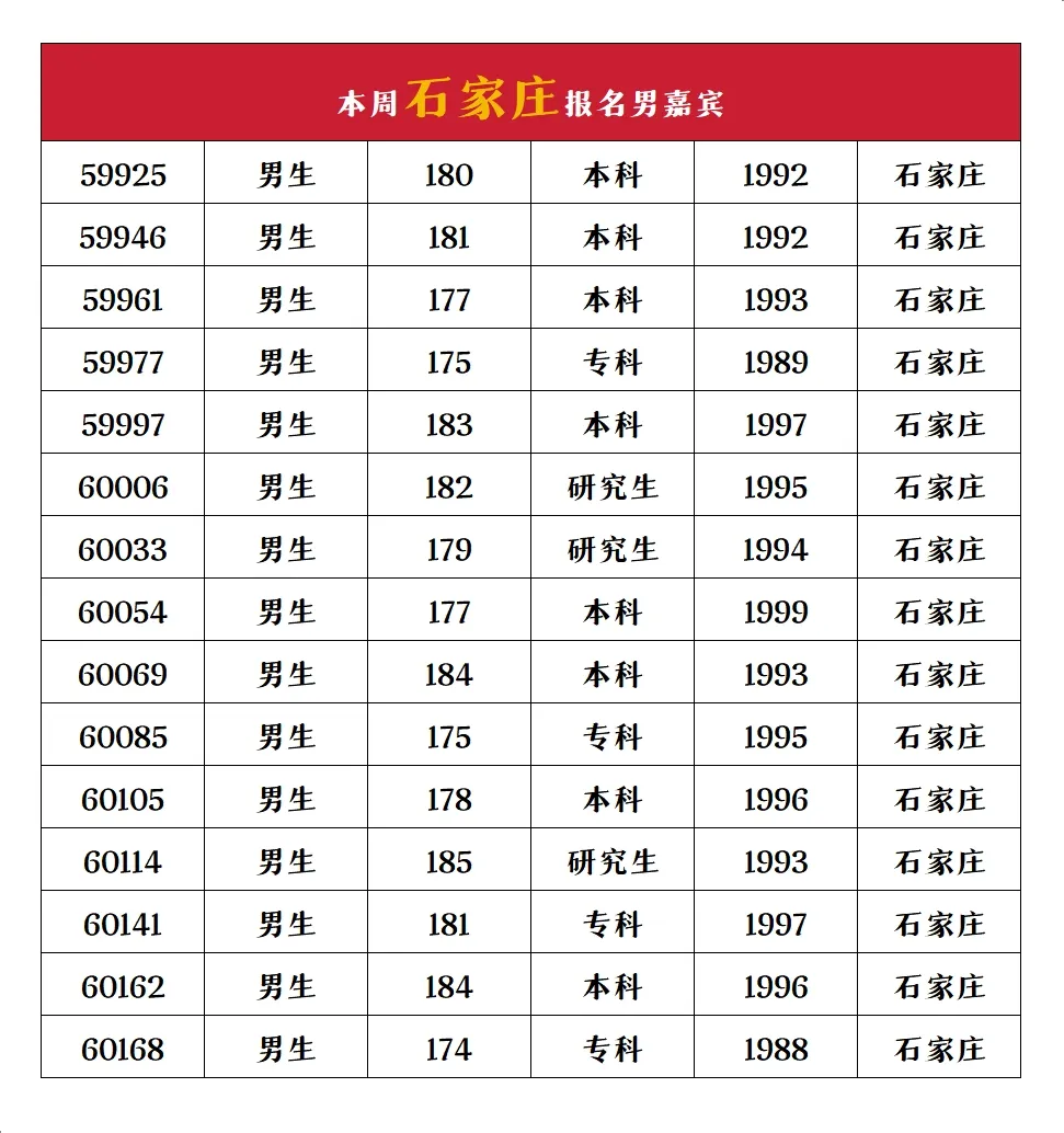 本期恋爱匹配已报名嘉宾,篇幅有限,每个城市仅展示部分嘉宾,目前河北开放城市:石家庄、保定、唐山、邯郸、沧州、邢台、廊坊、衡水、张家口。