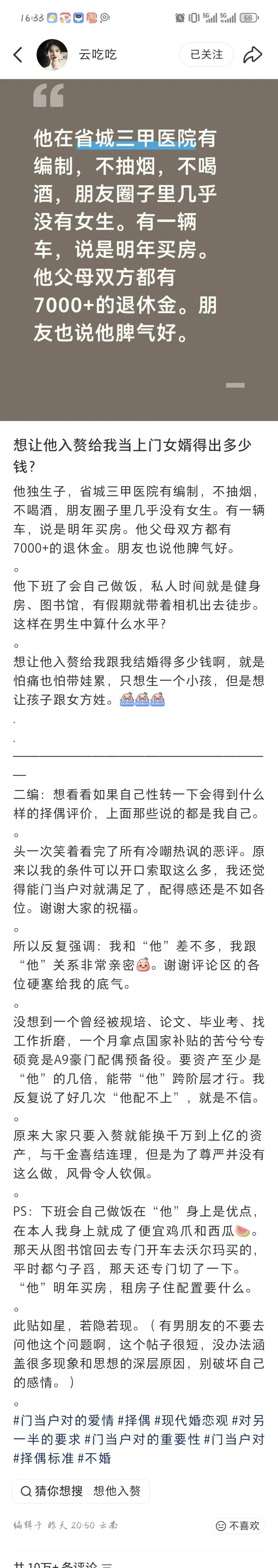 最近有条帖子挺火的。一位条件不错的女性,把自己的情况换到男性身上,问“男生入赘该出多少上门费”。结果评论区的男性网友吵翻了,张口就是几千万打底,还说入赘是“丢面子”“没尊严”。