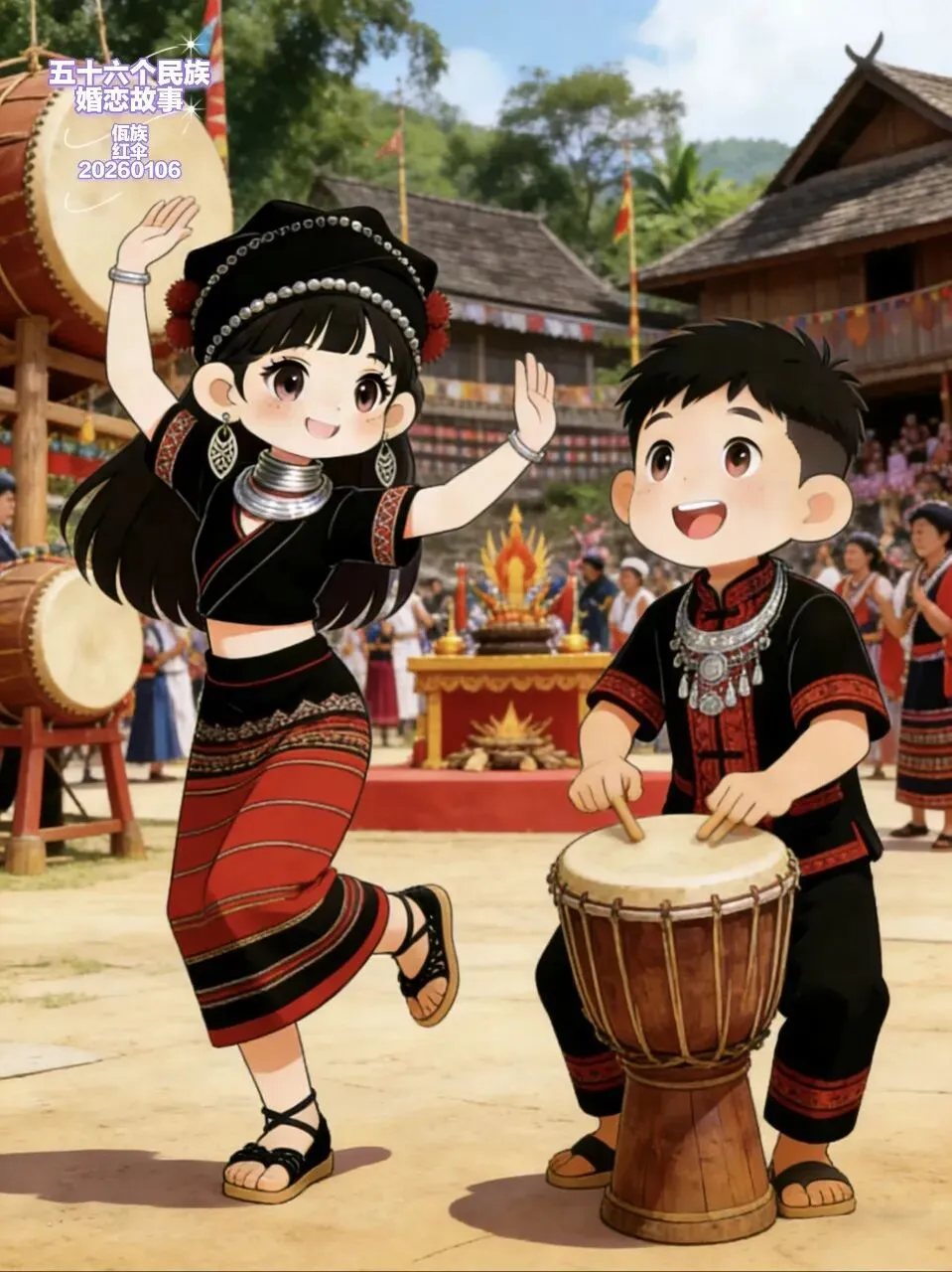 阿妹是寨子里最爱跳打歌的姑娘,红黑相间的筒裙裹着她纤细的腰,走动时裙摆上的几何纹样跟着旋,银项圈在脖颈间晃出细碎的光。她的阿爸是寨里的老鼓手,打小教她听鼓点辨心意,可阿妹总说,岩木的鼓点,是她听过最野、最暖的。