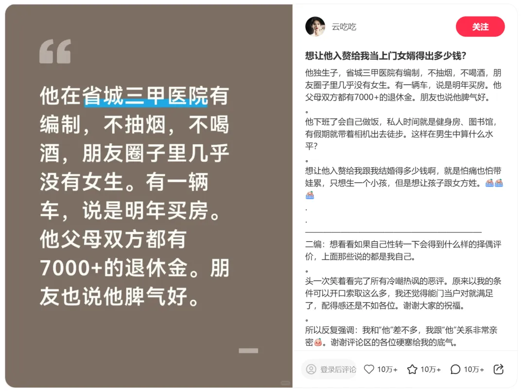 朋友给我分享了一个小红书上爆火的帖子,帖子题为《想让他入赘给我当上门女婿需要多少钱》,里面列举了男生条件: