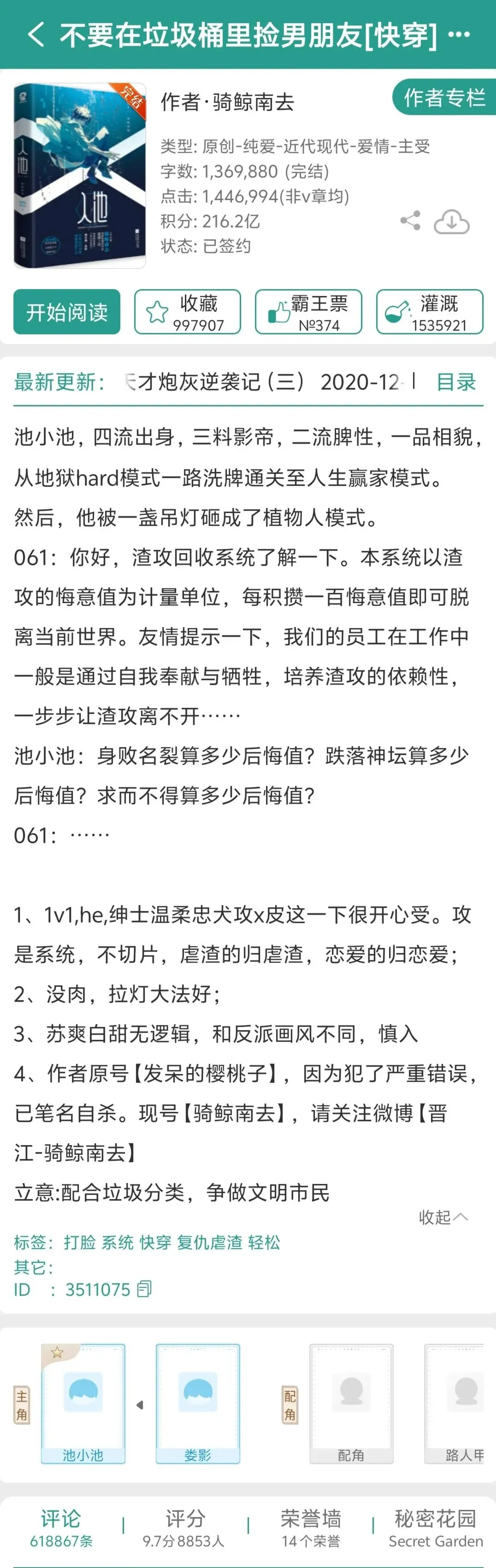同时,像作者大大所说虐渣的归虐渣,恋爱的归恋爱,在任务过程中,系统怕池小池沉溺,池小池却一直目标明确,要早点回自己的世界。系统061从欣慰松口气,到逐渐有点吃醋什么人值得池小池念念不忘,到发现原来自己就是池小池的的娄哥……