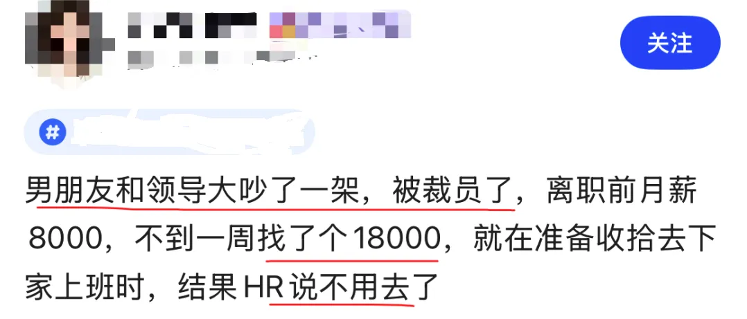 近日,看到一则职场故事,颇感唏嘘。一位姑娘的男朋友因与领导大吵一架而被裁员,原月薪八千。所幸他能力不俗,不出几日便斩获一份月薪一万八的新工作,堪称“逆风翻盘”。然而,就在他准备入职新东家时,却接到HR冷冰冰的通知:“不用来了。”剧情急转直下,一场即将到手的胜利化为泡影。