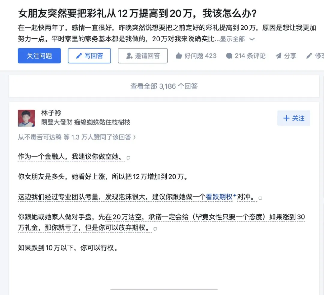 既然你喜欢用金融的思维去计算婚姻,那我也用这个方法来反驳你。(虽然我很讨厌这种自诩算计聪明精英,实则蠢的一批的口吻。)