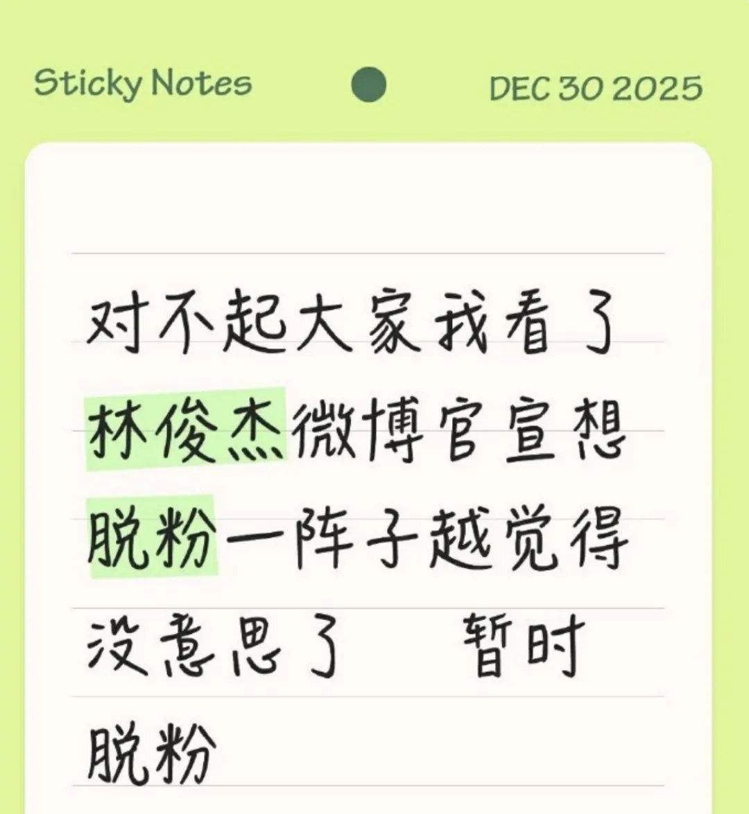 看了一眼粉丝发的脱粉小作文,感觉有些人追星已经追到“魔怔”的地步了,竟然把自己代入成林俊杰的女友,认为他官宣恋情是对粉丝的背叛。