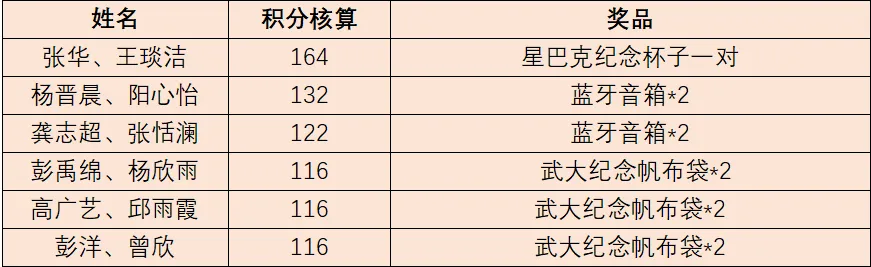 文末附上本次“怦然心动·甜蜜之旅”户外闯关活动积分前6的双人恋爱特工名单及组织送出的奖品清单: