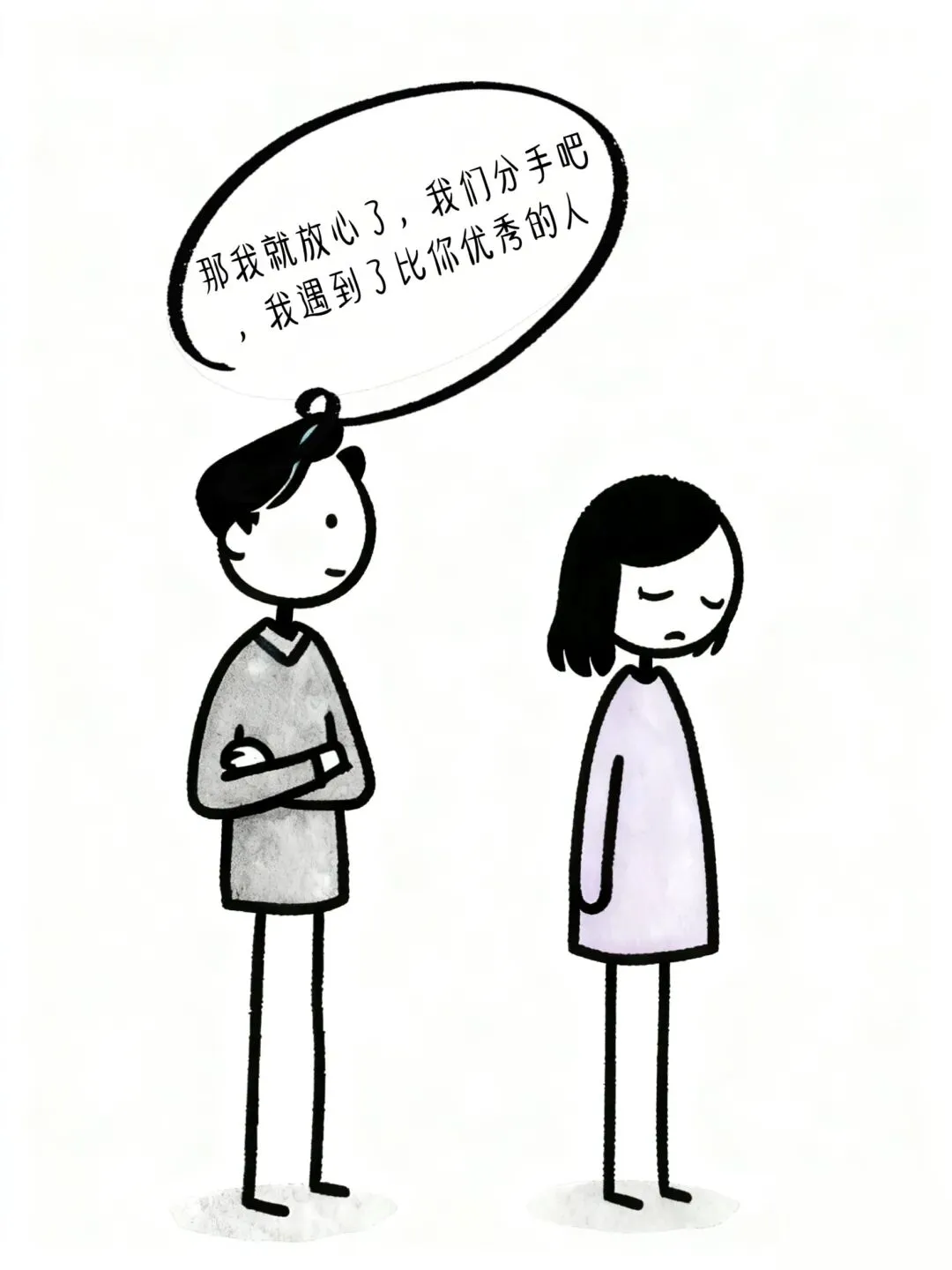 >趣味漫画:一男子约女友见面,忐忑的说:有更优秀的男孩你还会选择我吗?女:看情况,不过现在我还是喜欢你.男:那我就放心了,咱分手吧