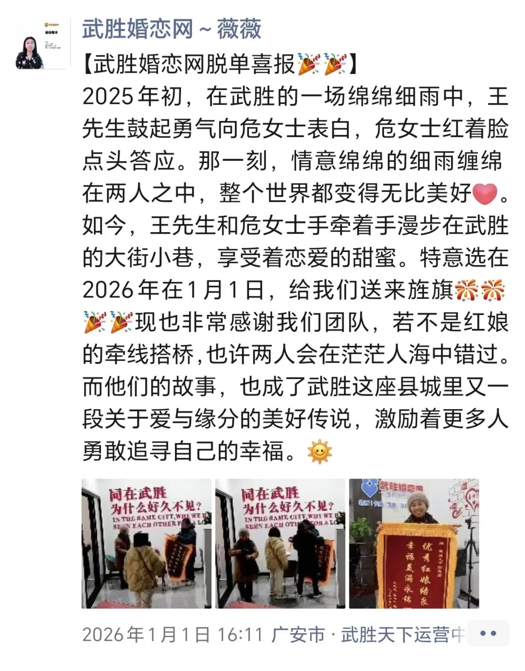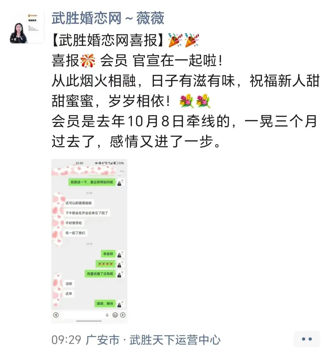 武胜的31岁小伙和29岁的姑娘。他们是通过我们的红娘老师牵线相识