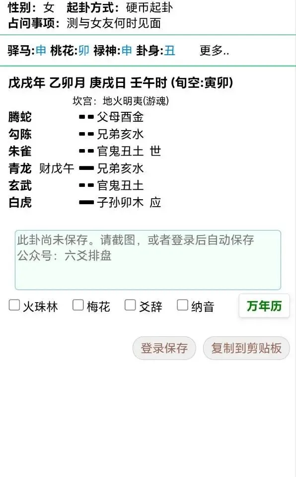 取妻财为用神。妻财午火旺相,但是伏藏不现,又被飞神亥水压制,亥水为兄弟,此为竞争者。另外,妻财又入日辰墓库,日辰入卦为官鬼爻,这里官鬼爻可不是男人,而是与世爻相同,都为女性。这都说明,卦主女友已经又有女友了。另外,应爻也可以代表对方,应爻子孙卯木旬空,与日辰相合,旬空为不诚心,不想见面,与日合也为有别人了。反馈:确实有人了,根本不理卦主。学习易学二十余年,少年时期便开始研习易经,精通六爻,实践无数,有着丰富的断卦经验,愿为有缘人解答疑惑,趋吉避凶,引导客户走出困境,斩获人生新机遇。
