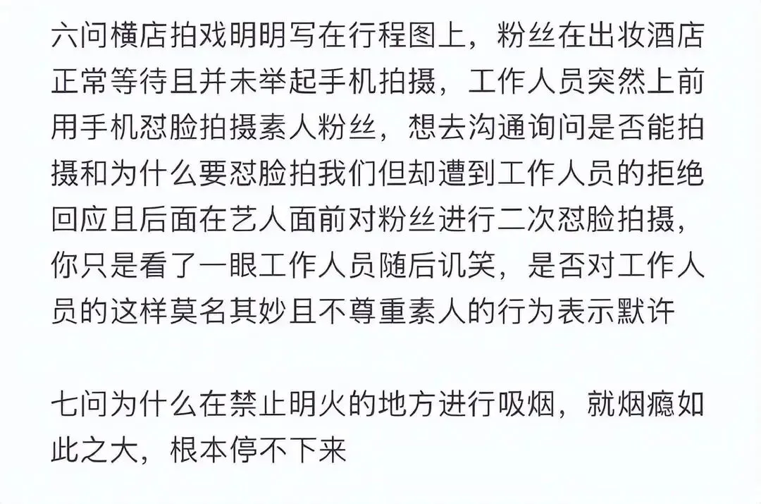此外,爆料还补充了其他“黑料”:包括在明确禁止烟火的拍摄场地多次吸烟,对工作人员态度傲慢等细节。这些碎片拼凑起来,描绘出的不再是那个屏幕前阳光亲和的大男孩,而是一个可能得意忘形、漠视规则的膨胀艺人。