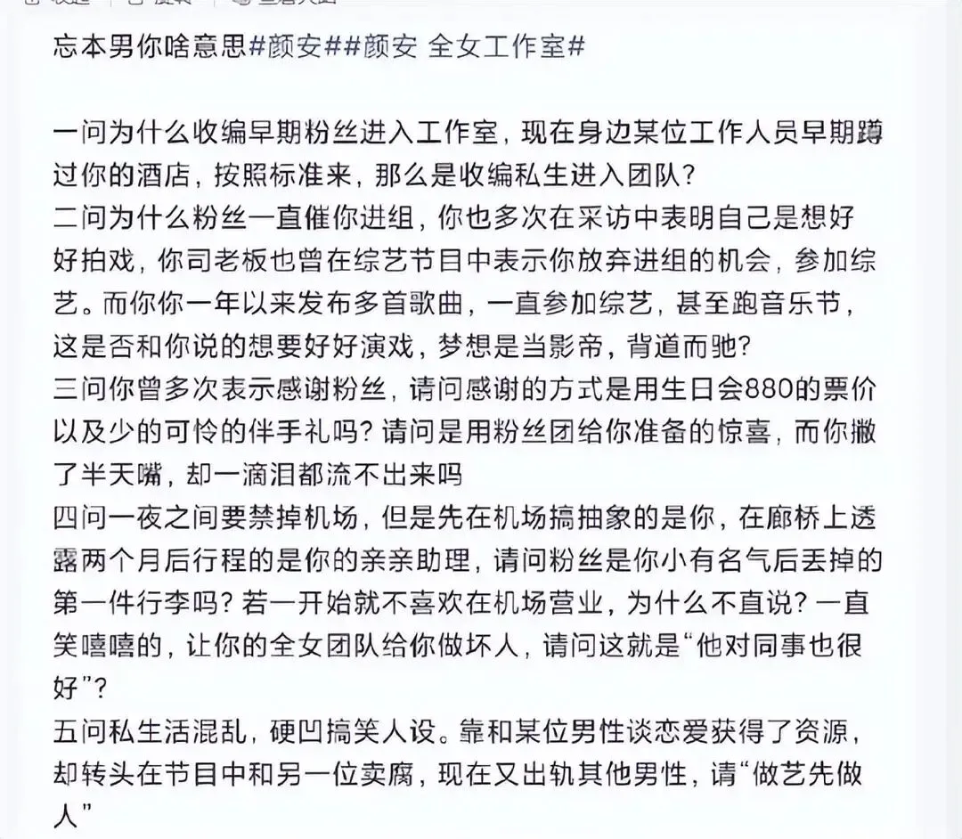 如果说“忘本”让粉丝失望,那么爆料中的第五条,则直接击穿了公众的想象。该条指控直指颜安私生活混乱,疑似为了获取影视资源,与某圈内男性交往,同时期内还与其他人保持不正当关系。