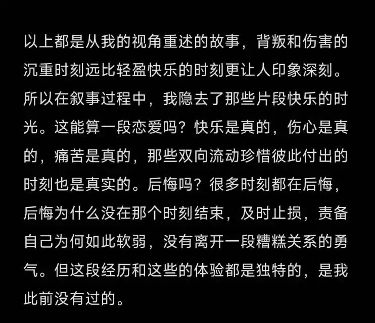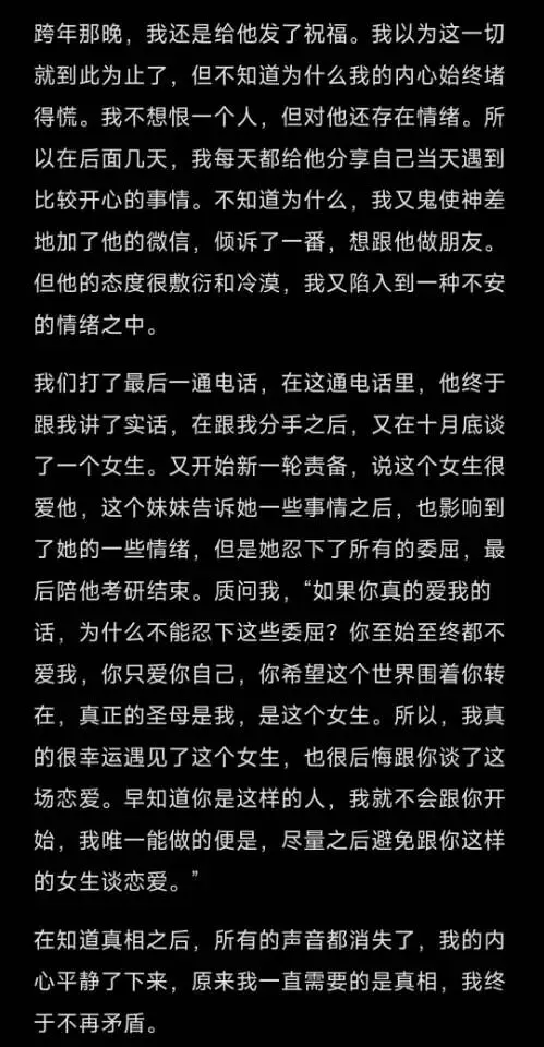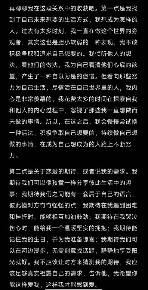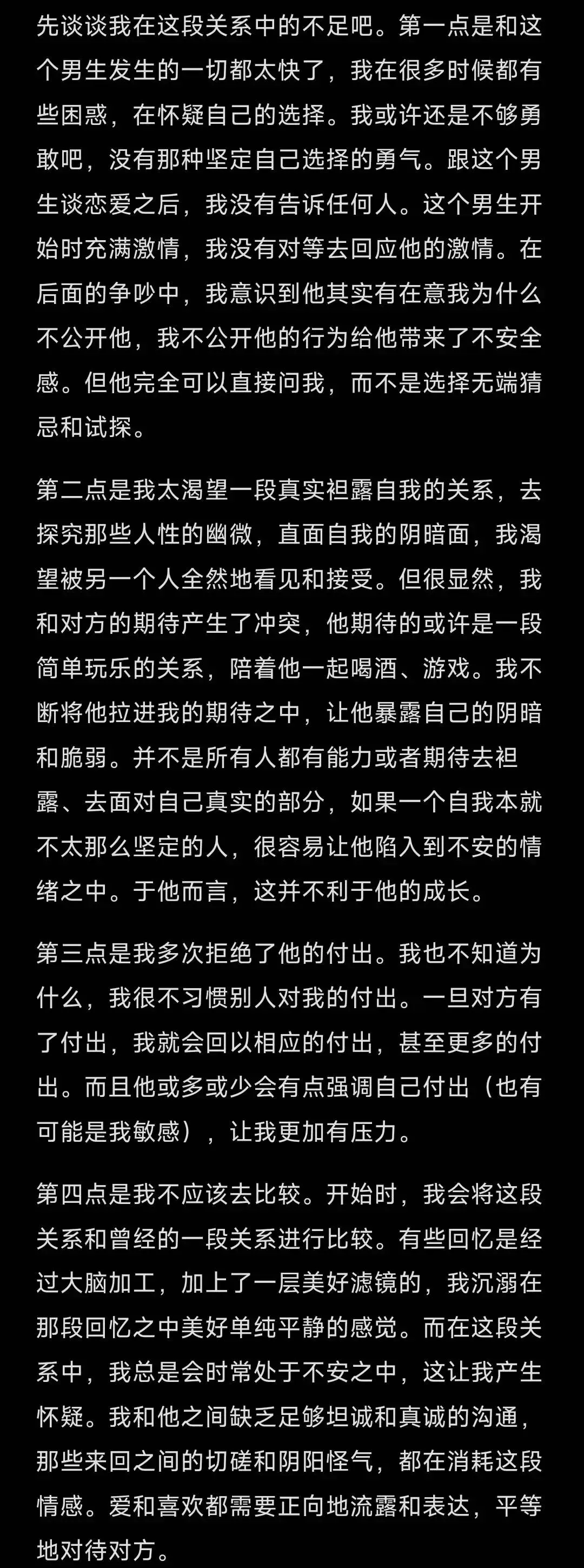求助,女朋友控制欲过剩怎么办?她好像把我当成儿子了,每时每刻都把我牢牢地护着。。 举个例子,周五晚上我和她躺床上刷手机,我刷到一款模型,随口说了句好帅,她就拿过去拍了个照片,今天一早她就出门去给我买回来了,这东西三千多块钱。。总之就是我想要的任何东西,相机、玩具、鞋子之类的,无论多少钱,我只要随便提一嘴,她都会直接买给我。。 不只是物质方面,情绪价值她也给的很足。比如说我们过马路,她一定要牵着我的手、带着我走;出去吃火锅或者烤肉,肉、菜、丸子都是她煮熟了再夹到我的盘子里或者喂我吃,连蘸料都是她去调的;冬天她经常怕我冷,就把她妈妈送给她的围巾手套给我戴;工作日如果她下班早了,她还会坐地铁到我公司来接我。。 这种情绪价值还体现在对我的无限包容和宠溺。期末复习那段时间,有些我的专业课我没怎么认真复习,她就把自己的复习放一边,问我拿了老师的PPT,帮我梳理了一份内容大纲(这份大纲细致到,我觉得老师可以对着这份大纲上课都没问题)。。还有一些期末大作业,以及我实习的临时任务,只要她觉得我压力大、来不及了,她都会在能力范围内+能力范围外帮我承担。但是她自己的事情她从来不让我帮她忙。 而且我发现她貌似非常乐在其中,而且对我的这种爱护会扩及我身边的人。比方说,她过生日,明明我和她已经吃过一个生日蛋糕了,她还会再买一个9寸的到我宿舍,让我和室友分着吃(注意是她过生日);还有像上周天气冷,她就给我实习的部门一共9个人每人买了一个果篮送过来,搞得大家都问我女朋友是什么身份。。 但是偏偏我又是一个比较佛系的,或者说“配得感”很低的人,我认为的恋爱首先应该是平等的,其次应该是简单朴素的。。所以说女朋友在我身上花钱、花时间、花精力我会觉得很不自在,因为我没有在她身上给她对等的付出,感觉我亏欠她了;但是每当我逼自己去给她花钱、更加努力认真地去呵护她的时候,我又会发现我根本不知道她需要什么,总觉得她想要的她都有了,她不想要的她也有了,什么化妆品、裙子、相机、首饰之类的,就搞得我自己也有点难受。。讲真的(我不是凡尔赛),就是我觉得我这个性格和她很不配,哪怕我发誓我真的很爱女朋友、我也很感激她,但是我真的没法做到和她一样这么高强度输出,所以我和她在一起除了享受,越来越多的反而是煎熬。 而且最近一段时间她开始在一些非必需品上给我花钱了,比如我前面提到的模型,我真的就是刷到了随口一说,我甚至也没细看那些细节,她还真的买来了,一个正常学生哪玩得起3000的玩具啊。还有相机,我已经有一台了,前几个月出新品了她又给我买了一台新的。我甚至有点想分手了,但是我如果提分手估计女朋友会很伤心。所以我该怎么办啊高铁上可以做什么打发时间?lz已经在二等座上蜗居了整整五小时,还要三小时才能到😭皮鼓都要坐爆炸了,在座椅上疯狂蠕动中lz量化推理只拿了2.3。。难以调理,直接与保研无缘了,因为lz记得当时保研政策上写数学这种绩点不能低于3.0,但是lz只有这一个学期学数学。。男生宿舍出现连续有节奏且低沉的啊啊啊声是何意味,大家放假宿舍没人了就可以放开玩了吗?知5宿舍群的事好奇怪 我觉得正常人拆开之后发现拿错了外卖的话 不会吃了别人的外卖吧 难道不应该拿下去或者发小助手道歉找失主啥的吗🤔 而且拿错的人发的截图 什么时间都没有 我真的很怀疑啊 如果是我自己也点了外面但是拿错了 一定会进订单截日期和时间的…但是大家的舆论导向让我没太懂cj硕士现在还是0offer,家乡的四大行省分也面试挂了,可能就是自己的笔试/面试能力过差,好自责。现在十分焦虑,感觉自己要毕业即失业了。。。。。根本不敢回家过年接受父母/亲戚的质询在一个父母带着参加的饭局上有个做生意很成功的长辈给我们桌上的小辈说,女孩子宁可给有钱人当小的也不要给穷人当妻子……当时听完感觉三观重塑了主包申到了新国立全奖,未来怎么规划才能效用最大化?好崩溃,分手一段时间了一直没联系突然收到前男友发的两千字长文,说他最近和另外一个女生交往了,那个女生叫他删除关于前任的所有照片,他知道应该这么做,但是觉得非常悲伤,如割肉般悲伤。然后又讲了一大堆他在我们这段关系中又恨又爱的,他的一堆混乱的想法,最后还强调我对他有多么重要,这些年来都好爱我????? 是不是疯了啊。。。。。。为什么要莫名其妙来打扰我平静的生活。。。。。。。量化推理2.7……爆了。唉但感觉老师已经捞过了,期末卡60……😮💨还是好难受我写一个小程序,定时检测是否出了新的期末成绩,有没有人愿意帮我测试一下啊()关于打呼噜这件事可以说是世纪大战了,首先声明 lz 不打呼噜,希望能够站在客观角度给大家一些建议。 针对这种情况,有两类解决办法: 1️⃣打呼噜的人一端:可以佩戴止鼾器(lz 没戴过不知道难受程度,看起来不是很舒服) 2️⃣不打呼噜的一端:戴耳塞(关于耳塞的选择有很多,建议大家买个好点的,几十块也可以买到很静音的了)🔴总结:虽然 lz 不打呼,但是 lz 还是建议大家在处理这个问题的时候,最好选择方法 2️⃣。 首先,不打呼的 uu 们不要有“都怪 ta 打呼我才戴耳塞”的想法,除了打呼之外楼道里也有可能有其他噪音,戴耳塞睡觉可以保证睡眠质量,即使没有人打呼,戴耳