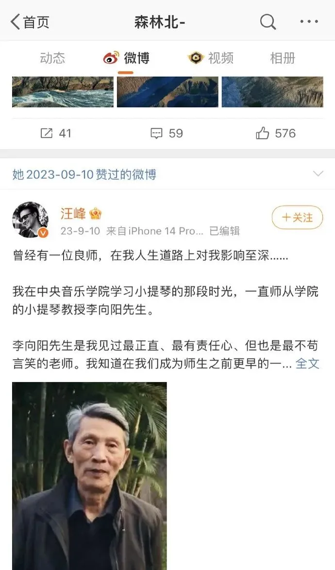 网友发现2023年9月,森林北点赞过汪峰微博。