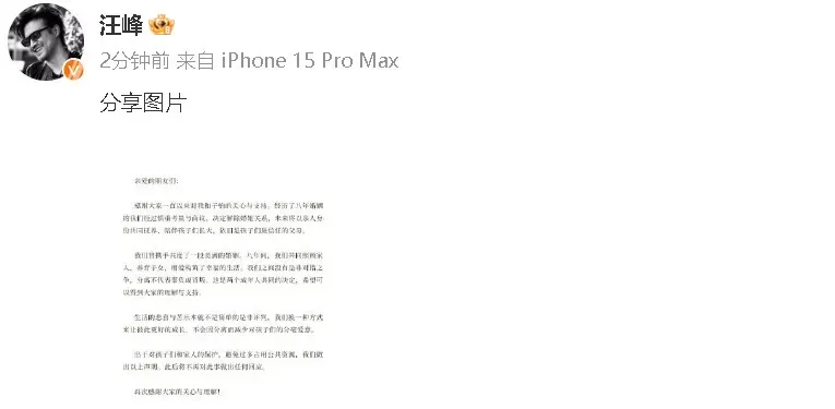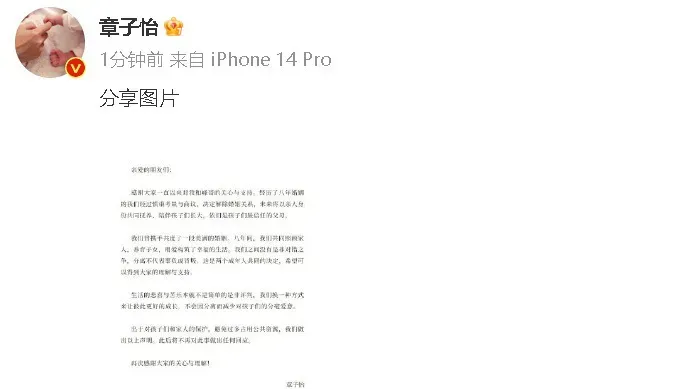 据悉,2023年10月23日,章子怡和汪峰官宣离婚,结束八年婚姻,两人写道:分离不代表辜负或背叛,这是两个成年人共同的决定。