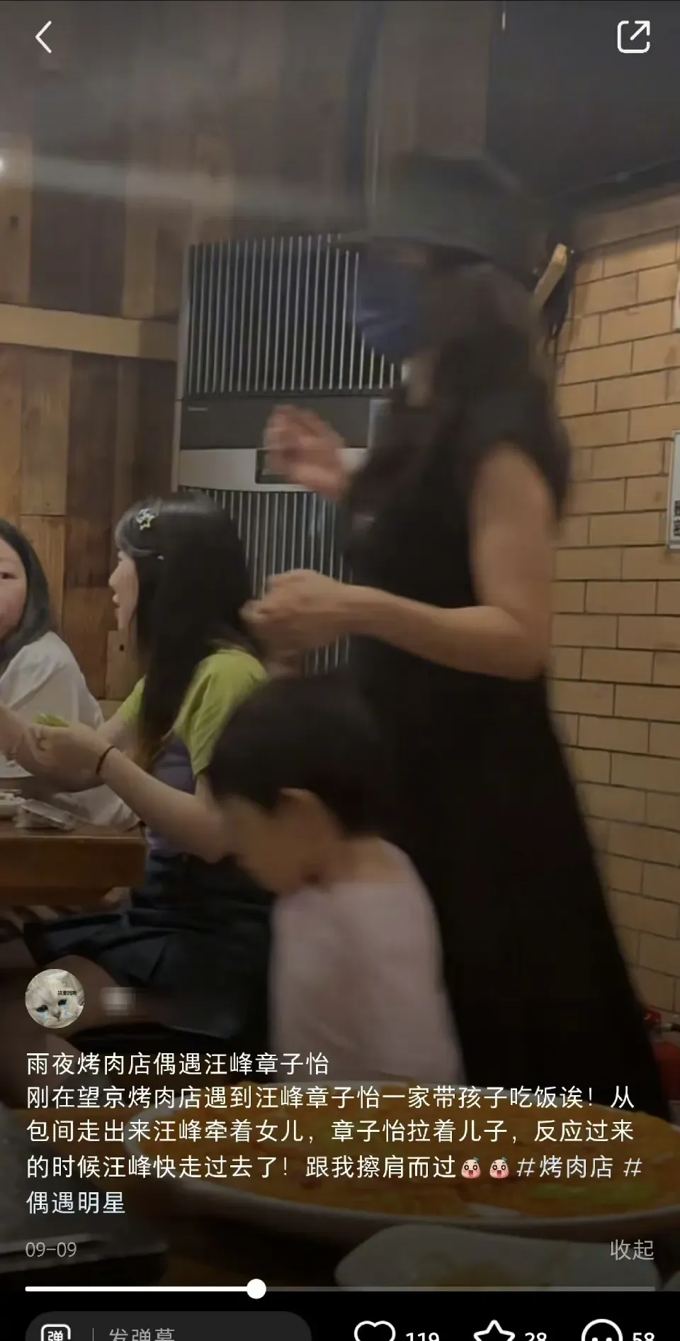 2023年9月,有网友偶遇汪峰和章子怡带孩子吃烤肉。