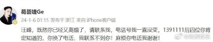 葛荟婕喊话汪峰,称联系不上汪峰。