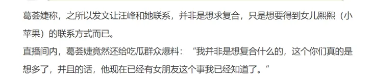 接着,葛荟婕在直播间称自己不是想和汪峰复合,只是想得到女儿小苹果的联系方式,葛荟婕说知道汪峰已经有女友了。