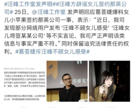 随后,汪峰工作室发声明否认女儿签约那英公司。