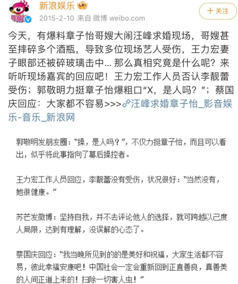 汪峰求婚章子怡后,一张疑似章子怡哥哥的朋友圈在网上曝光,表达对汪峰私生活的强烈不满。