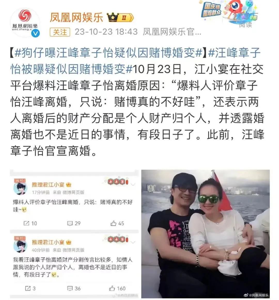 关于汪峰和章子怡离婚的原因众说纷纭,博主江小宴发博称赌博不好,引起热议。