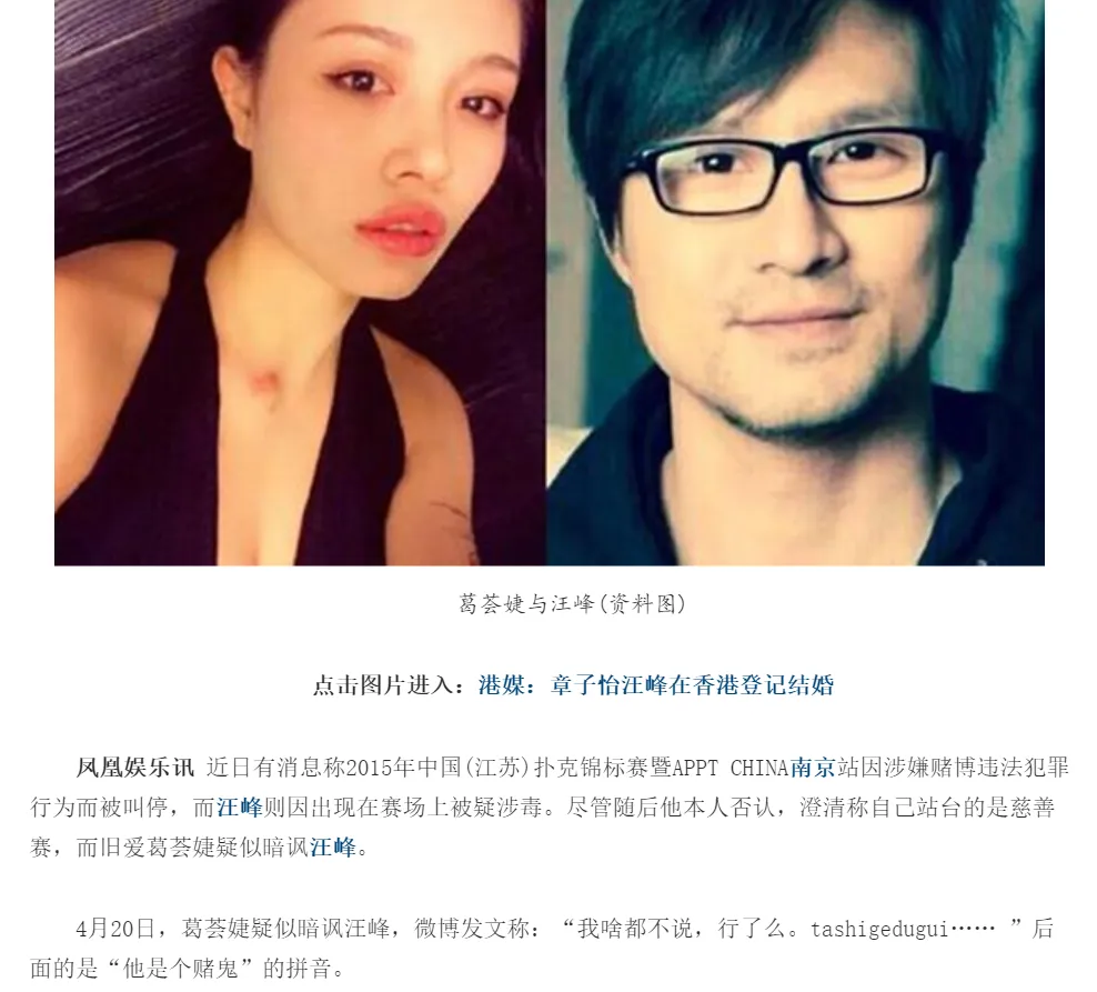 葛荟婕“内涵”过汪峰迷恋赌博。