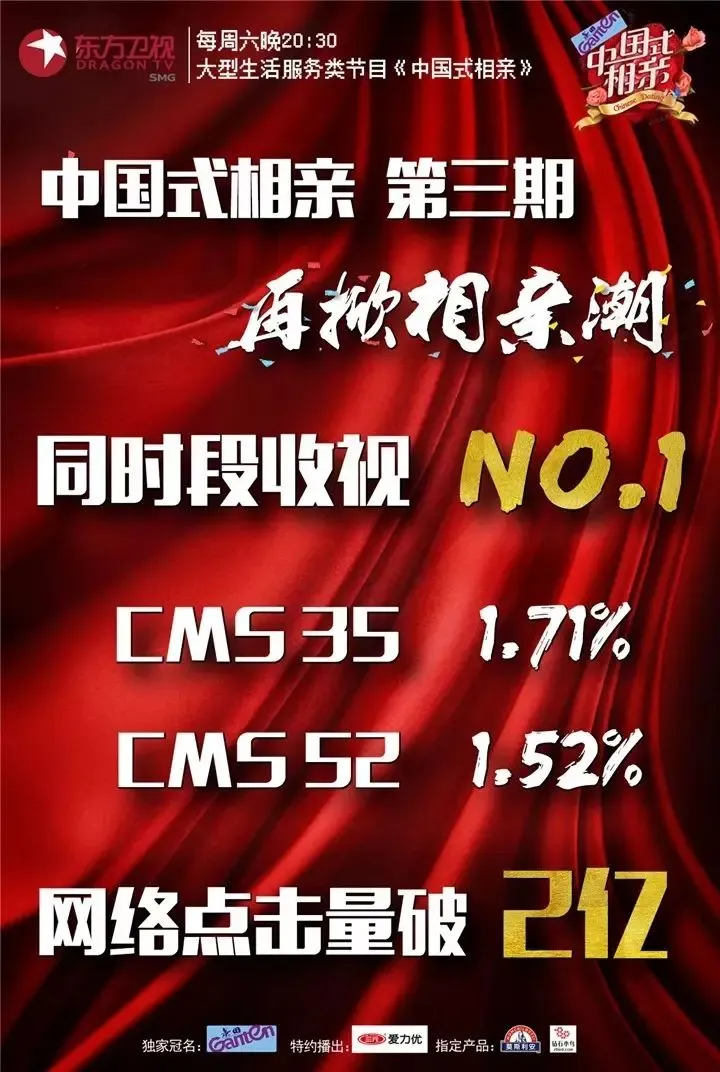 上周六,由景田纯净水独家冠名播出的《中国式相亲》第三期收视再创新高。同时段收视率持续第一。CM35城收视率1.71%,CM52城收视率1.52%,网络点击量破2亿。这场相亲热潮从开播至今吸睛力不言而喻。