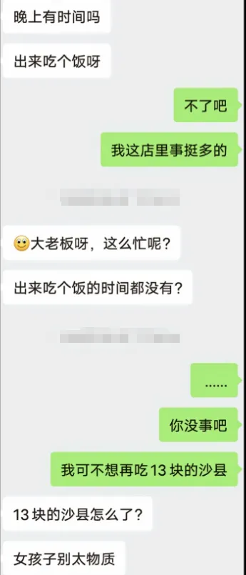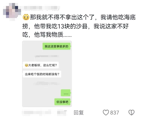 那我就不得不拿出这个了,我请他吃海底捞,他带我吃13块的沙县,我说这家不好吃,他骂我物质... ..