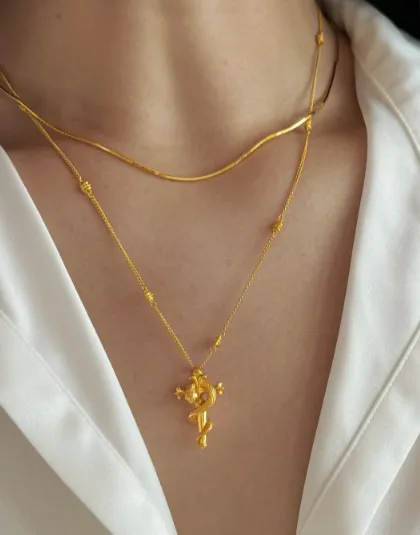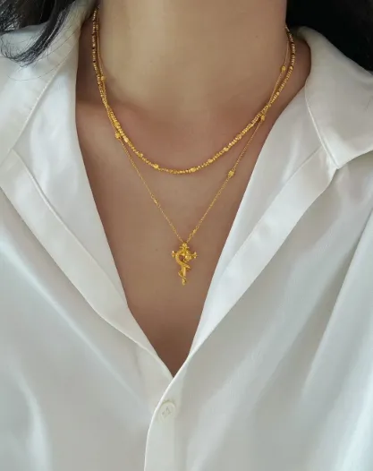项链是细蛇骨链那种 锁骨位置刚刚好的 长度我试了两档 扣在第二格的时候配圆领T会更显锁骨线 接着搭衬衫开两颗扣 层次直接起飞 还有就是我有时候会叠一条短choker 再配一个小吊坠 这个组合特别适合拍照 近景不会显得空 对了 重量大概2.5克左右 所以衣领也不会被拽变形的