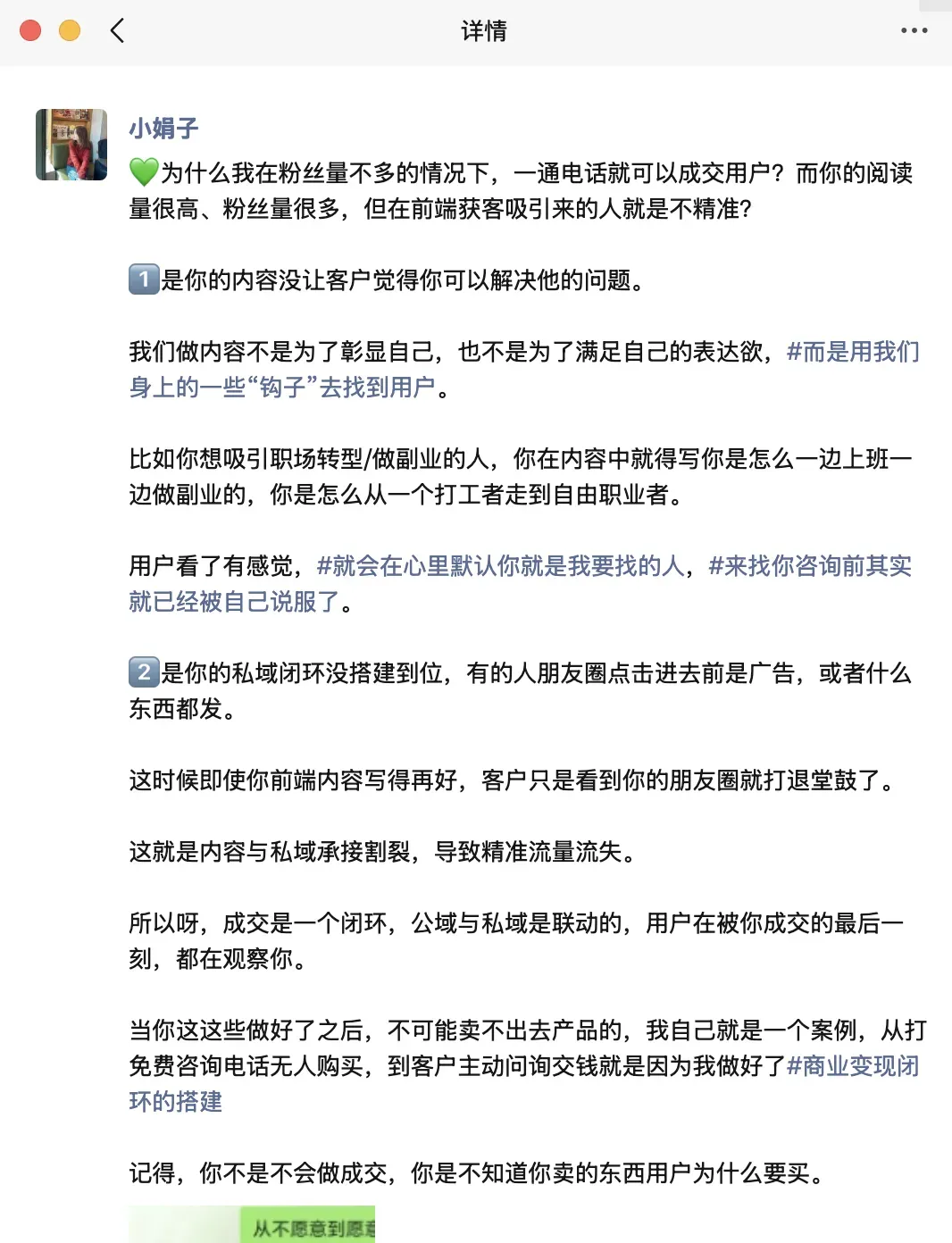 我是小娟子,用两份工作换来自己如今的自媒体事业,从0到经济独立,付费学员300+,专注公众号内容获客+私域变现闭环搭建服务,精准解决公众号内容获客,IP商业体系搭建、业务模式梳理问题。如果你已经开始写公众号、做内容,但没有闭环、没有产品、没有转化、没有体系、更没有方向,欢迎你来聊,我们一起打造商业闭环,实现创收。➕xiaojuanzi2001围观高能量搞钱朋友圈。