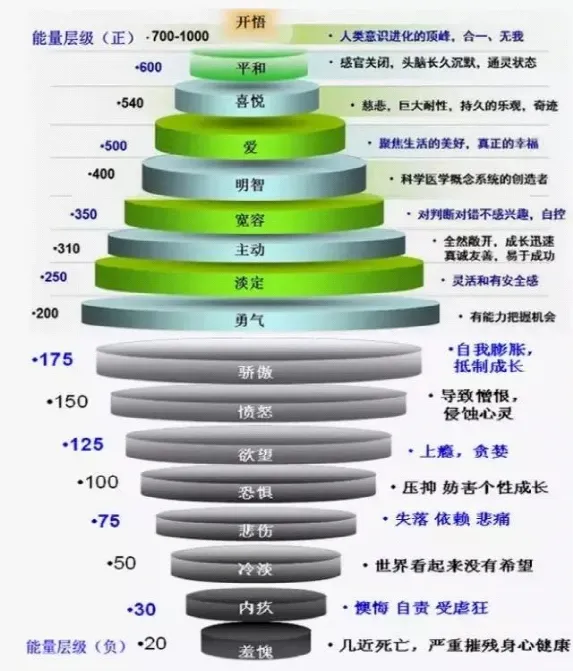 低处是:冷淡、悲伤、恐惧、欲望、愤怒、骄傲。你可一一对照自己的感受是在哪个能量频率层级。而做出自我改变需要正200——勇气;停止计较是250——淡定;主动付出是310的频率。