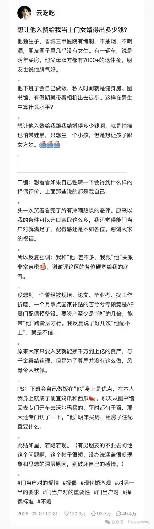 与男性选择退场形成鲜明对比的是,女性可能会在这一时期更积极地参与婚恋活动,但驱动力,会从浪漫情感更多转向对安全感的需求。公众议题里,「剩女」话题频繁登上热搜,而「光棍」话题则隐入尘烟,恰恰说明了女性相对男性而言,更愿意去寻找伴侣、去交流自己的婚恋状况。另一方面,经济独立与高学历,也让女性不再视婚姻为生存必需品,经济波动虽然强化了她们对伴侣稳定性的看重,也增加了他们对伴侣水准的要求:仅仅有房有车是不够的,还需要升级到「全款无贷」。但如果没有?那么选择「独身主义」,成为「新女性」,又何妨?虽然我的关注者里,70%是男性,只有30%是女性,但就是这30%的女性,贡献了我70%的咨询量。而近几年咨询我的女性中,越来越多的女性,选择了独立买房,以及不婚不育。作为男性,我深感叹息。而作为她们的朋友,我则诚挚地欣赏、尊重与祝福她们。可以自由地选择恋爱,也可以自由地选择不恋,不依附于人,而独立于世。前几天,小红书上出现了一篇被网友们誉为「2026年第一神贴」的帖子:一个「性转」的社会学实验,竟撕掉了两性婚恋中脆弱的遮羞布。最终,这个帖子因「两性对立」而删掉了。但帖子消失易,问题解决难。我们依然还是要面对「彩礼」、「男女不平等」、「两性对立」这些绕不开的问题。「两性对立」又如一朵逐渐扩大的乌云般,笼罩在我国婚恋市场的上空。给原本就困难重重的婚恋市场,加上了极大的强度。结婚都千难万难了,生育就更是无从谈起,22022年起,人口就已经开始了负增长:粘性杆菌无疑属于自然界最有意思的微生物。当年景好的时候,它们以单细胞的形式独立存在,很像是草履虫;而当条件变得恶劣的时候,它们就爬着集中到一个中心地方,几乎奇迹般地变成了一条蛞蝓。粘性杆菌如此,人亦会如此。在经济面临阶段性挑战的当下,一个人生存相比于两个人搭伙,必然会面临更多的风险。这也是为什么被当下人们推崇的婚姻,是「门当户对」、是「优势互补」,它在确保双方相敬如宾、人格独立的基础之上,又能做到优势互补、降低风险。在古代,生产力和经济集中在男性身上,女性只有寻得有情郎才好在社会上有一席之地,单身或结婚并不是主观意愿的选择,而是客观现实的必然结果。现在,女性也可以有独立的收入来源,「婚姻」也从她们的必选项变成了可选项。在我家里,「去父留子」就偶尔被老婆拿出来威慑我,而我呢,也会以「她不要我,有得是人也不要我」挽留。我在家里的地位,可见一斑。从进化论的观点看,性本质上就是鼓励我们将基因传承给后代的一种机能。你富有、帅气,你美丽、聪慧,但你没有下一代,你的基因就会湮没于时间的洪流中。在生物医学高度发达的今天,更有一部分「自私的基因」选择了直接绕开「婚姻」,非婚生子、非婚育子。最有名的,大概就是「中国首父」了:古代税赋的增加80%以上依赖人口,国家繁荣富足,兵力强盛,守护人民的安居乐业,二者相生相成,所谓“国泰民安”。所以在古代,是有「官媒」的,据《晋书武帝纪》记载,司马炎提出“十七父母不嫁者,使长吏配之。”可以说,古代的人口提升,是靠压迫女性而达到的,让女性成为生育工具、让女性穿上三寸金莲,让女性学会三从四德,就会让女性生了又生。在现代,对人的尊重成为了基本,女性在经济获得独立的同时,也拥有了对婚姻说不、对育儿说不的权利,人口生育率自然会下降。放眼望去,世界上现有的生育率高的国家,无一不是落后的:在当下的中国,高昂的房价与不确定的未来,又更加抑制了大家的生育意愿。作为婚姻的过来人,面对当下的环境与婚恋市场,给正在迷茫、还在寻找的朋友们,一些微小的建议:1.相亲成功本质上是概率问题,只要基数足够大,总会找到过得去的,在自身情况提无可提之后,增加自己的「曝光量」和「见面量」,总归是有效的。2.万物皆有裂痕,那是光照进来的地方。不要自卑于自己的不完美,也不要苛责于他人的不完美。我们本就不该去寻找完美,而应去寻找「适合」。3.成年人,只筛选,不教育,只选择,不改变。就算选择「潜力股」,其拥有的品质也应该是从一到零,而不是从零到一的无中生有。4.经济基础决定上层建筑,如果纠结不定,就选择更有钱的。夫妻间的很多矛盾,都可以用「没有足够多的钱」来解释。