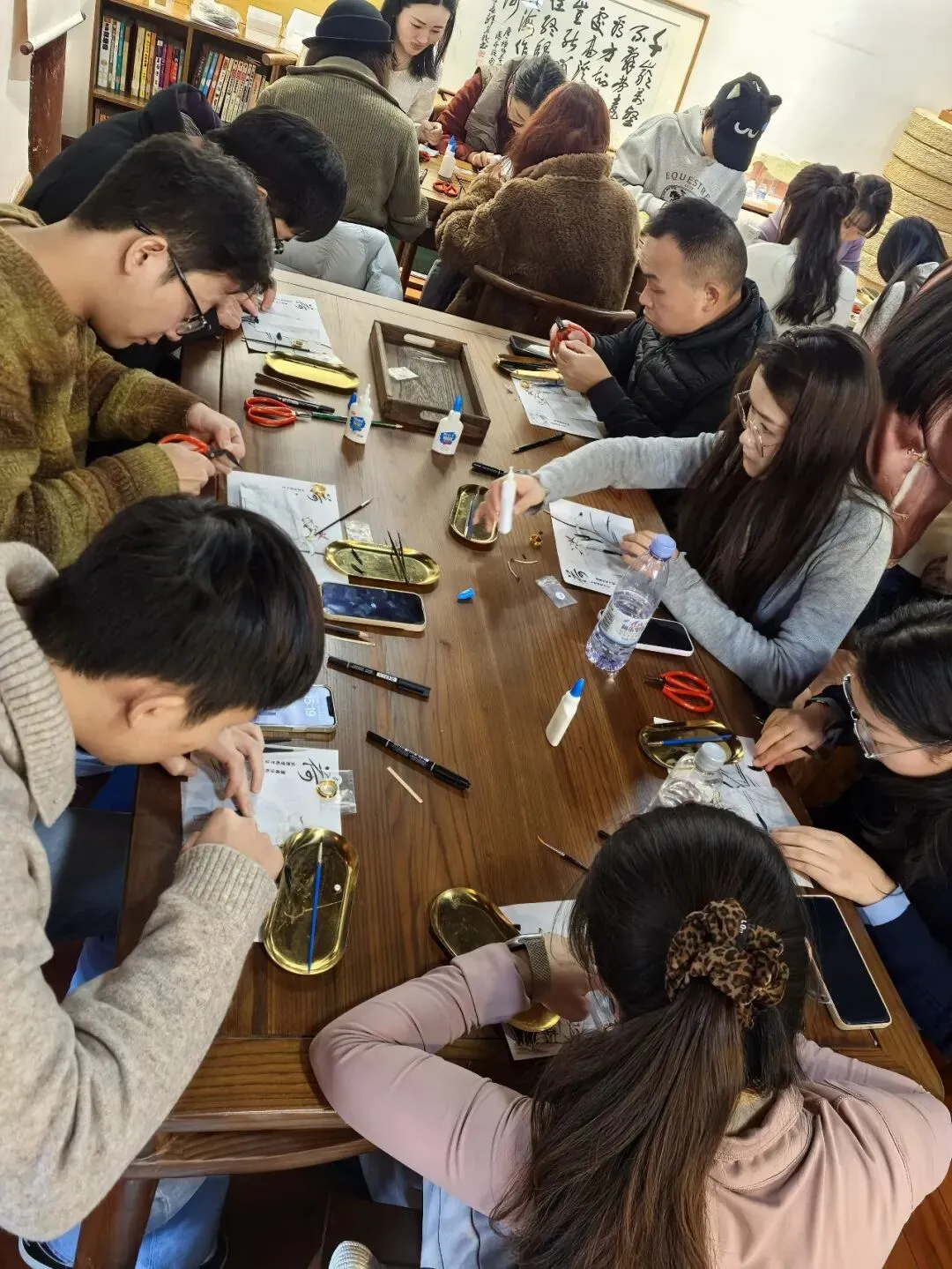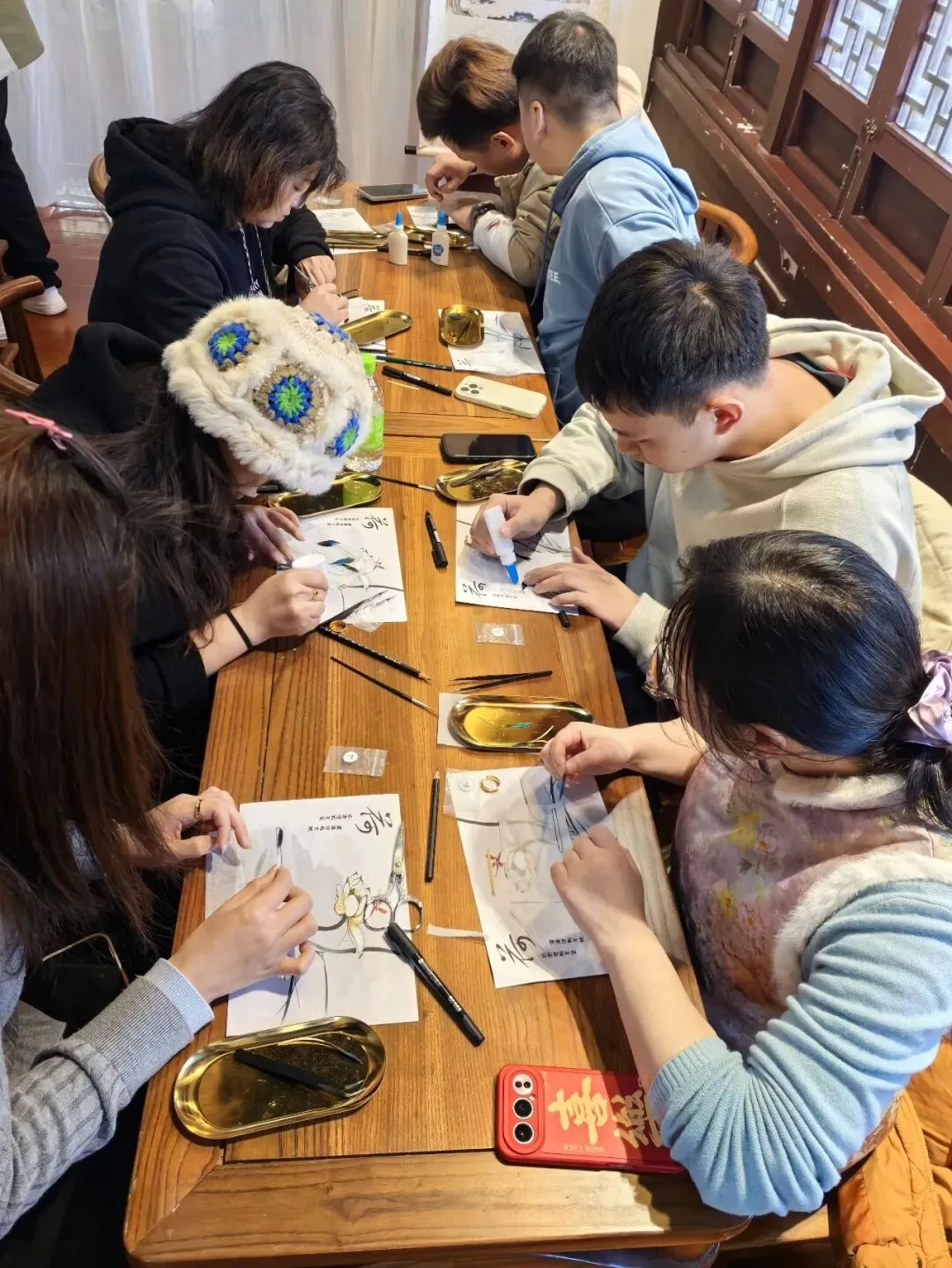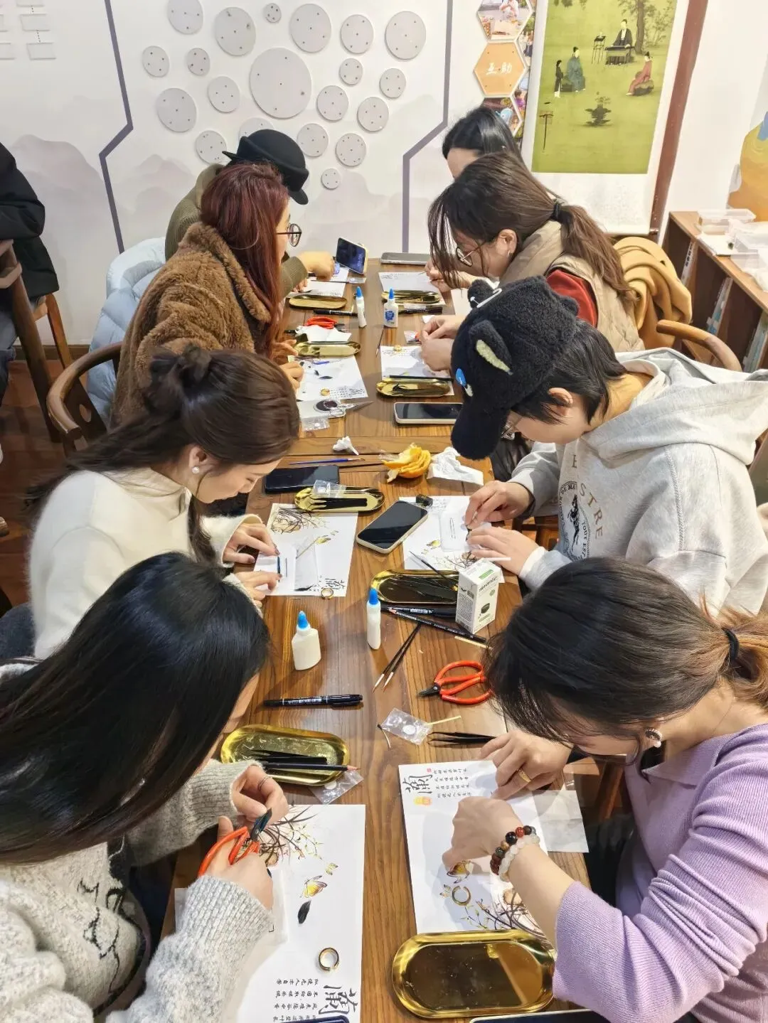 平日里设计芯片、变速器的理工男,此刻对着小小的戒圈,比划着羽毛的排列角度,严谨得像在布局精密电路;那些从事电商、综艺、短剧的校友,一边做,一边已经不自觉地在调整光线,为手中的半成品寻找最美的拍摄角度;还有那位幼师出身的女孩子,手指翻飞,动作灵巧得连老师都频频点头……这一刻,没有网红、没有剧宣、没有工程师、没有老师,只有一群沉浸在古老手艺中的探索者,彼此间的请教、帮忙、玩笑,让陌生的隔阂迅速消融。