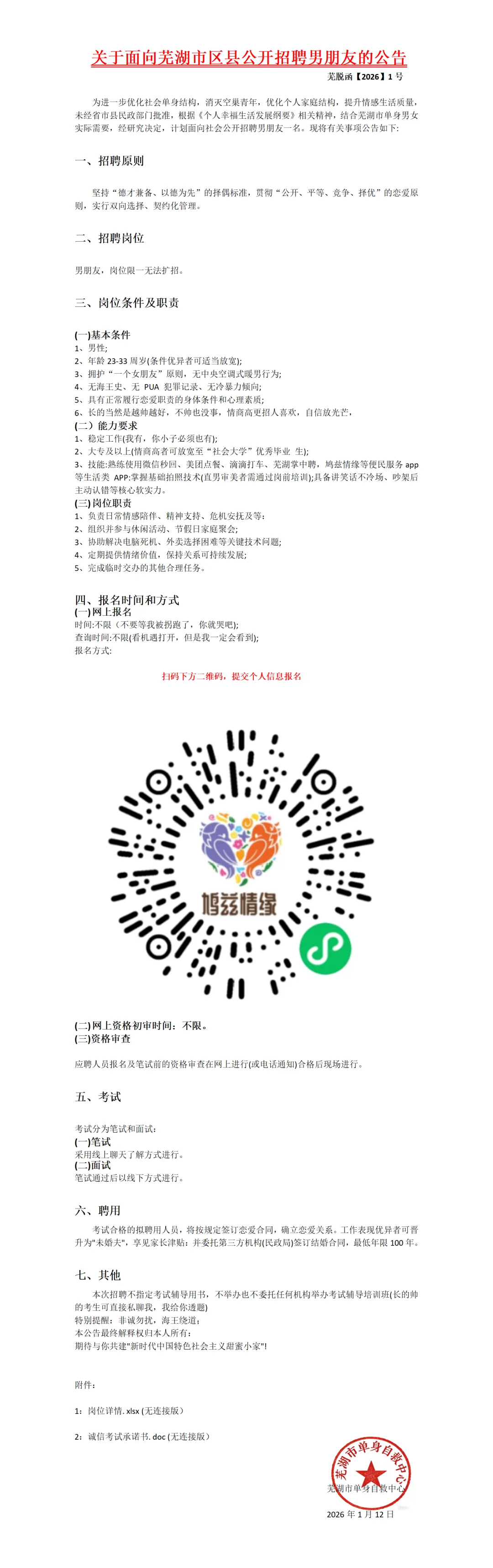 >关于面向芜湖市区县公开招聘男朋友的公告