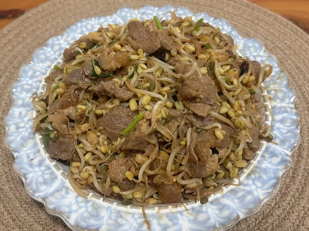 午餐:米饭200克,清炒平菇150克,豆芽炒牛肉200克(这个豆芽炒牛肉真的很好吃,之前有发过做法的哦)。