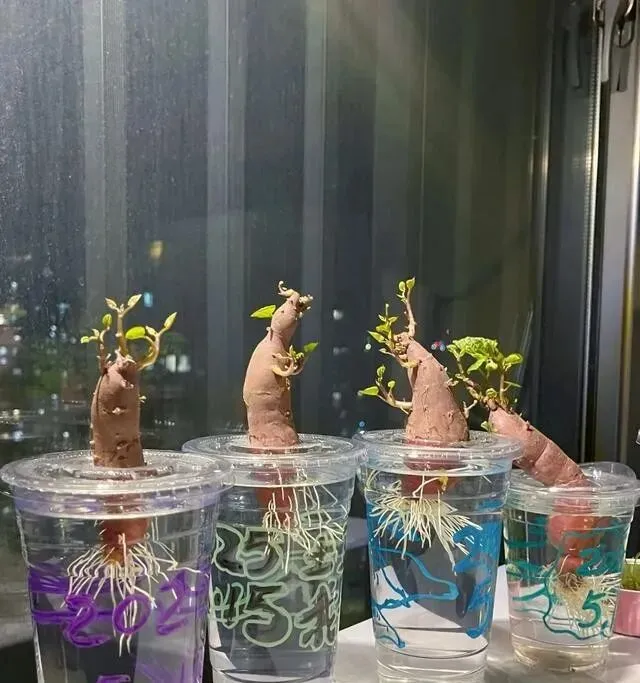 浙江一个小伙 , 用奶茶杯养红薯 , 养出了一堆"妖怪" , 有的像老鼠探头探脑 , 有的张牙舞爪像怪兽 , 还有的憨憨的 , 跟小熊似的 , 他女朋友看完直接说:美如妖!